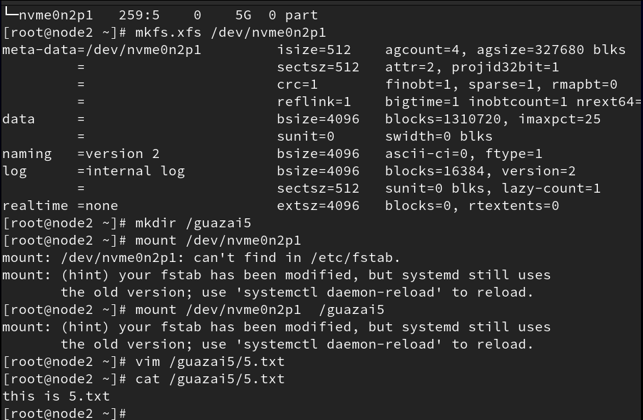 第三块硬盘,虚拟磁盘类型选择NVME。大小选择15G。按gpt格式分区。分一个主分区。大小为5G。主分区创建xfs类型的文件系统,挂载到/guazai5目录,在其中存入5.txt的文件,其文件内容是this is 5.txt。