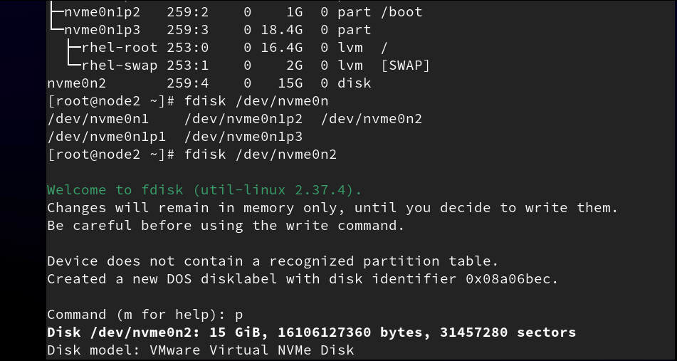 /dev/nvme0n2p1 2048 4196351 4194304 2G 83 Linux #刚刚分好的分区Command (m for help): n #输入n,添加分区