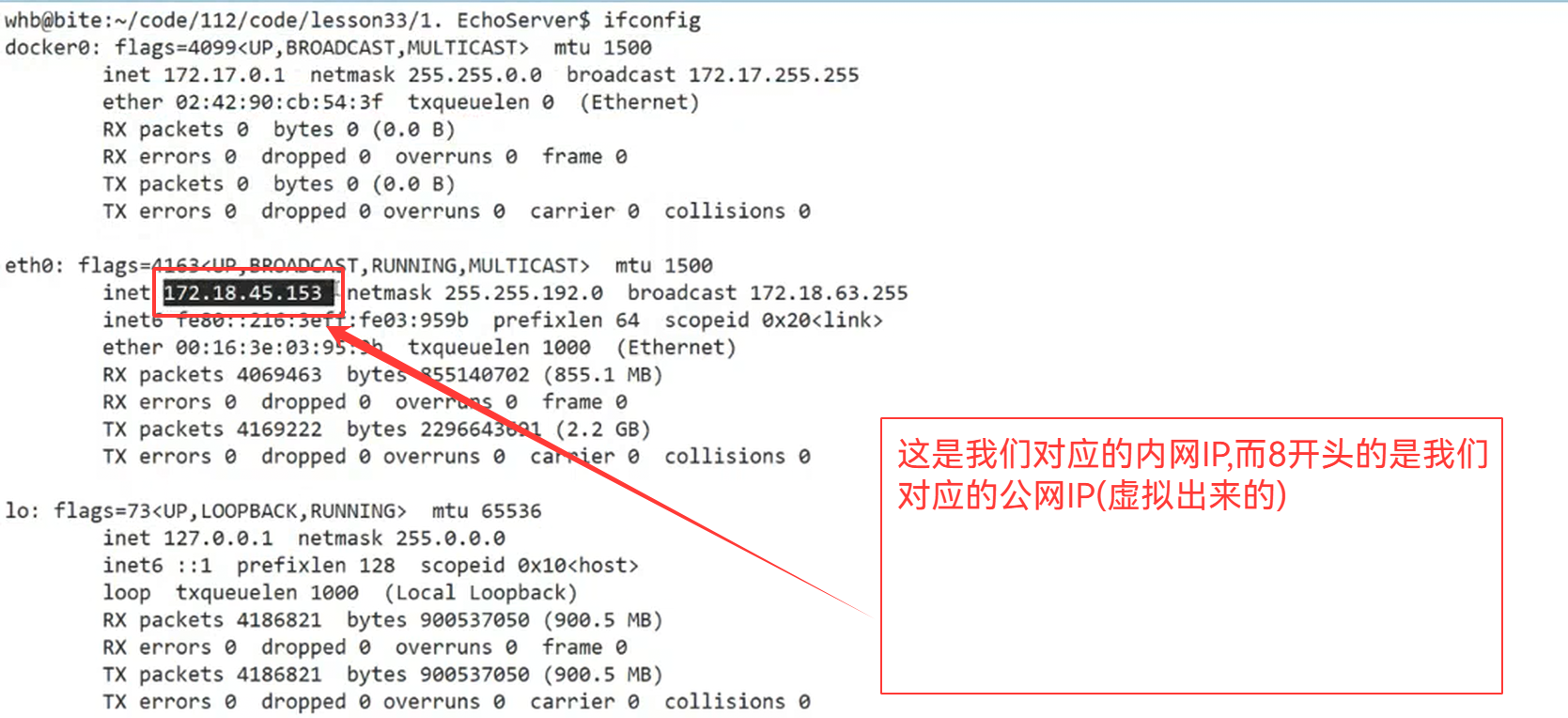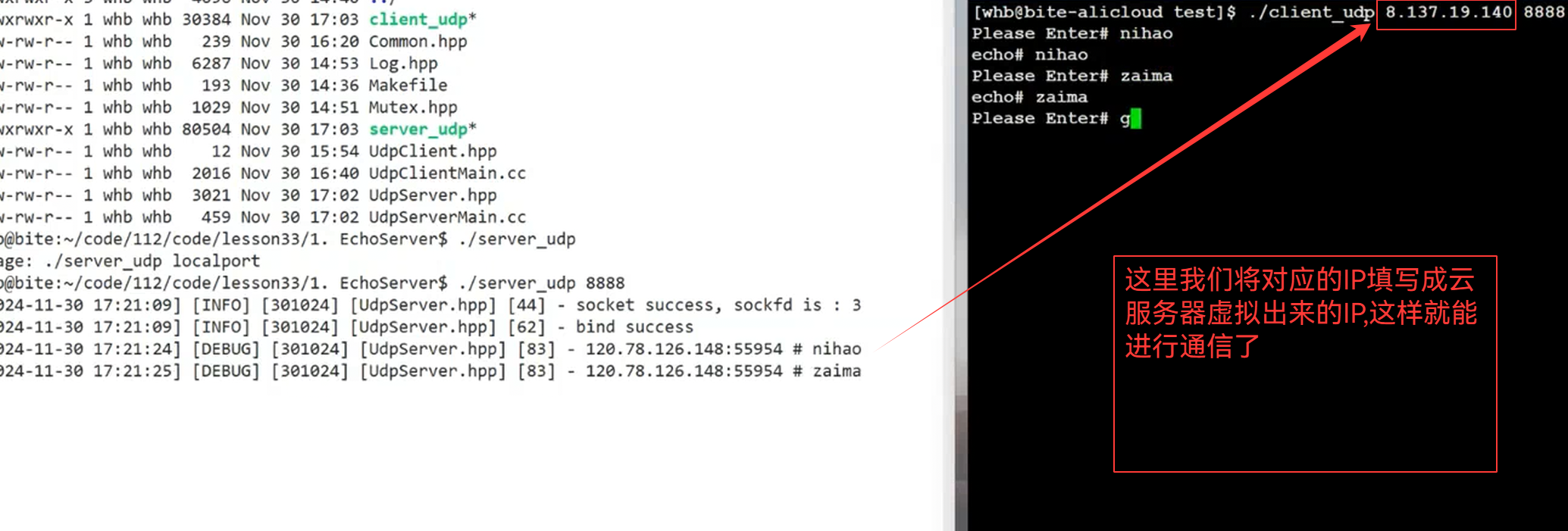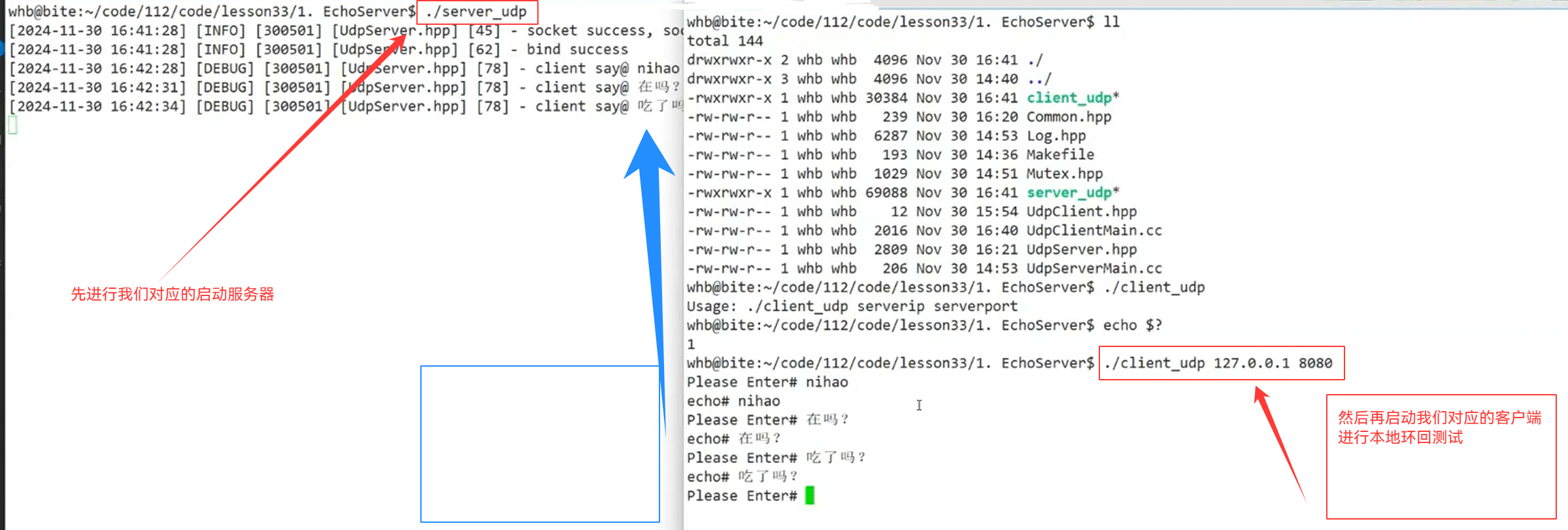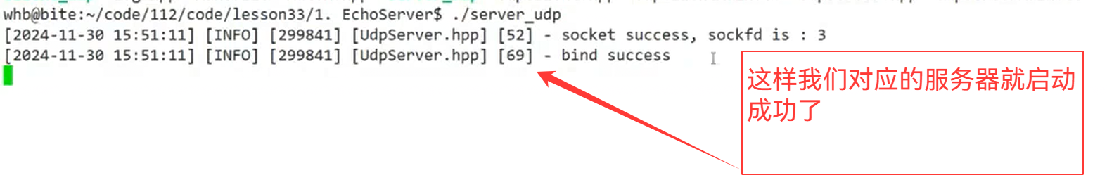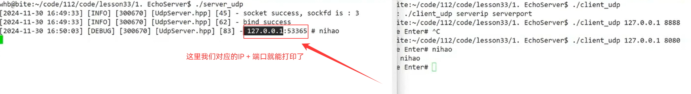 public:UdpServer(uint16_t port = gdefaultport):_sockfd(gsockfd),_port(port),_isrunning(false){}void InitServer(){// 1.创建套接字_sockfd = ::socket(AF_INET, SOCK_DGRAM, 0);if (_sockfd < 0){LOG(LogLevel::FATAL) << "socket: " << strerror(errno);Die(SOCKET_ERR);}LOG(LogLevel::INFO) << "socket success, sockfd is : " << _sockfd;// 2.填充网络信息,再进行bindstruct sockaddr_in local;bzero(&local,sizeof(local));local.sin_family = AF_INET;local.sin_port = ::htons(_port); //要被发送给对方的,即要发送到网络中local.sin_addr.s_addr = INADDR_ANY;// 2.1 bind :: 设置进入内核中int n = ::bind(_sockfd,CONV(&local),sizeof(local));if(n < 0){LOG(LogLevel::FATAL) << "bind: " << strerror(errno);Die(BIND_ERR);}LOG(LogLevel::INFO) << "bind success";}void Start(){_isrunning = true;while(true){char inbuffer[1024];struct sockaddr_in peer;socklen_t len = sizeof(peer);ssize_t n = ::recvfrom(_sockfd,inbuffer,sizeof(inbuffer)-1,0,CONV(&peer),&len);if(n > 0){//1.消息内容 && 2.谁给我发的uint16_t clientport = ::ntohs(peer.sin_port);std::string clientip = ::inet_ntoa(peer.sin_addr);inbuffer[n] = 0;std::string clientinfo = clientip + " : " + std::to_string(clientport) + " # " + inbuffer;LOG(LogLevel::DEBUG) << clientinfo;std::string echo_string = "echo# ";echo_string += inbuffer;::sendto(_sockfd,echo_string.c_str(),echo_string.size(),0,CONV(&peer),sizeof(peer));}}}~UdpServer(){}private:int _sockfd;uint16_t _port; //服务器的端口bool _isrunning; //服务器运行状态