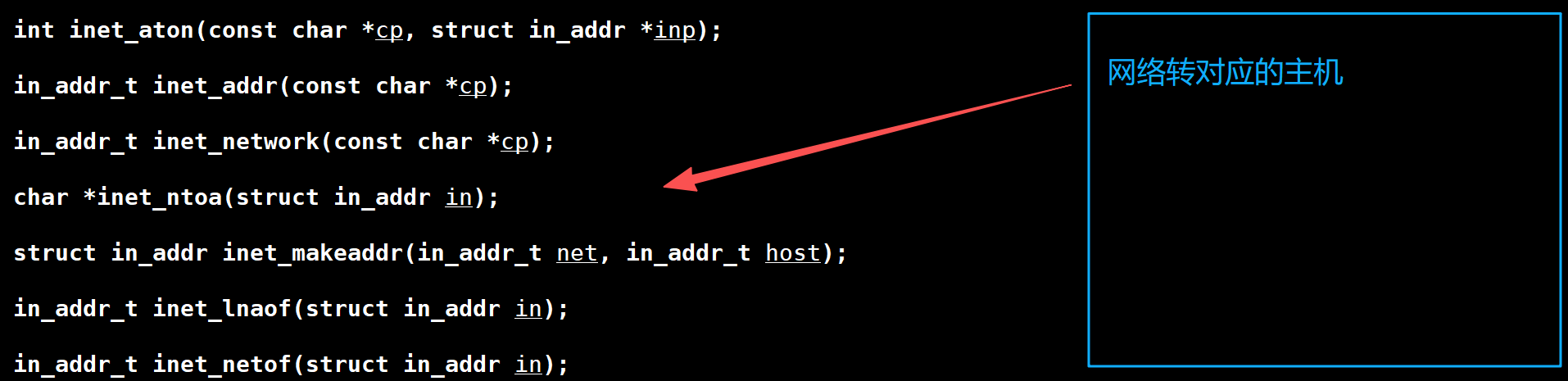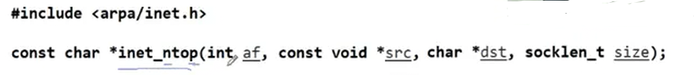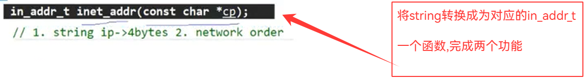 private:void PortNetToHost(){_port = ::ntohs(_net_addr.sin_port);}void IpNetToHost(){char ipbuffer[64];const char* ip = ::inet_ntop(AF_INET,&_net_addr.sin_addr,ipbuffer,sizeof(ipbuffer));_ip = ipbuffer;(void)ip;}