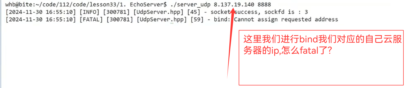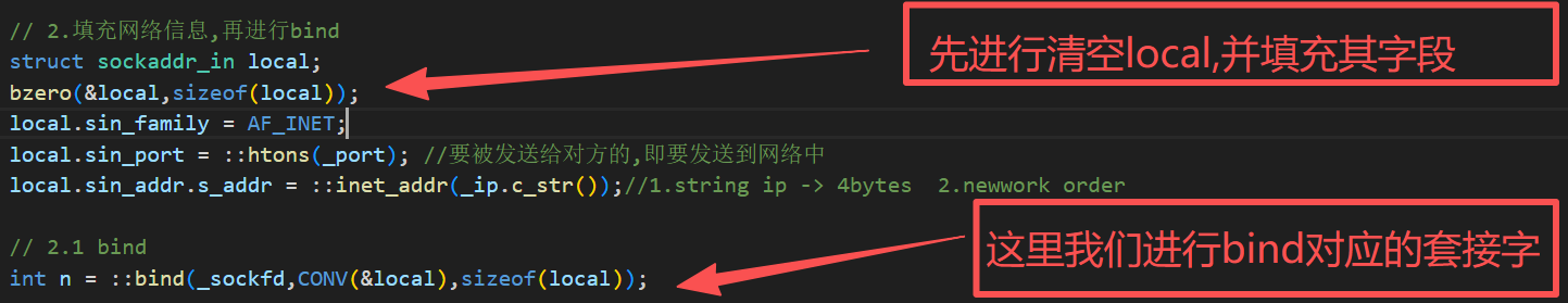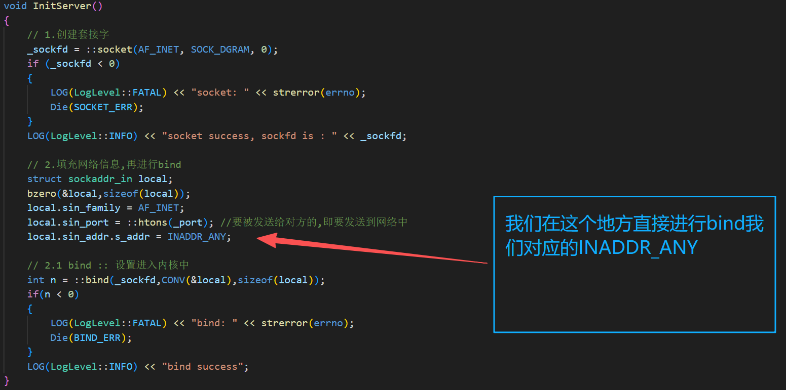 void InitServer(){// 1.创建套接字_sockfd = ::socket(AF_INET, SOCK_DGRAM, 0);if (_sockfd < 0){LOG(LogLevel::FATAL) << "socket: " << strerror(errno);Die(1);}LOG(LogLevel::INFO) << "socket success, sockfd is : " << _sockfd;// 2.填充网络信息,再进行bindstruct sockaddr_in local;bzero(&local,sizeof(local));local.sin_family = AF_INET;local.sin_port = ::htons(_port); //要被发送给对方的,即要发送到网络中local.sin_addr.s_addr = ::inet_addr(_ip.c_str());//1.string ip -> 4bytes 2.newwork order// 2.1 bindint n = ::bind(_sockfd,CONV(&local),sizeof(local));}