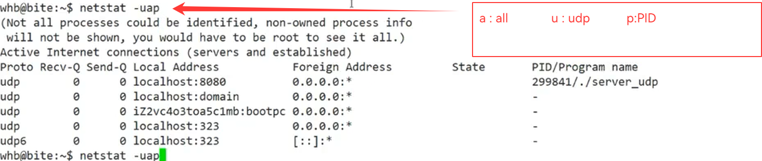 {if(argc != 3){std::cerr << "Usage: " << argv[0] << " serverip serverport" << std::endl;Die(USAGE_ERR);}std::string serverip = argv[1];uint16_t serverport = std::stoi(argv[2]);//1.创建socketint sockfd = ::socket(AF_INET,SOCK_DGRAM,0);if (sockfd < 0){std::cerr << "scoket error" << std::endl;Die(SOCKET_ERR);}//1.1填充server信息struct sockaddr_in server;memset(&server,0,sizeof(server));server.sin_family = AF_INET;server.sin_port = ::htons(serverport); //要被发送给对方的,即要发送到网络中server.sin_addr.s_addr = ::inet_addr(serverip.c_str());//2.client donewhile(true){std::cout << "please Enter# " << std::endl;std::string message;std::getline(std::cin,message);// client 不需要进行bind吗? socket <->socket// client 必须要有自己的ip和端口!但是客户端,不需要自己显示调用bind!!// 而是,客户端首次sendto消息的时候,由OS自动进行bind// 1.如何理解client自动随机bind端口号? 一个端口号,由OS自动进行bind(客户端不需要被人找到)// 2.如何理解server需要显示的bind? 服务器端口号必须稳定,所以这里不能由OS随机bindint n = ::sendto(sockfd,message.c_str(),message.size(),0,CONV(&server),sizeof(server));(void)n;struct sockaddr_in temp;socklen_t len = sizeof(temp);char buffer[1024];n = ::recvfrom(sockfd,buffer,sizeof(buffer)-1,0,CONV(&temp),&len);if(n > 0){buffer[n] = 0;std::cout << buffer << std::endl;}}return 0;