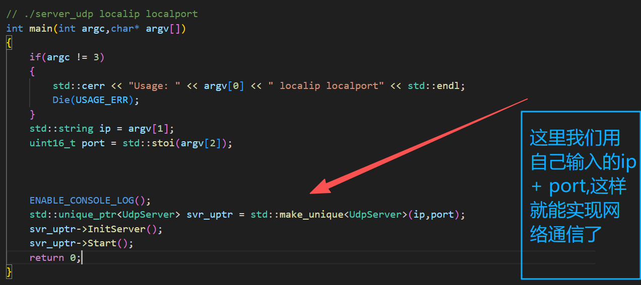 {if(argc != 2){std::cerr << "Usage: " << argv[0] << " localport" << std::endl;Die(USAGE_ERR);}uint16_t port = std::stoi(argv[1]);ENABLE_CONSOLE_LOG();std::unique_ptr<UdpServer> svr_uptr = std::make_unique<UdpServer>(port);svr_uptr->InitServer();svr_uptr->Start();return 0;