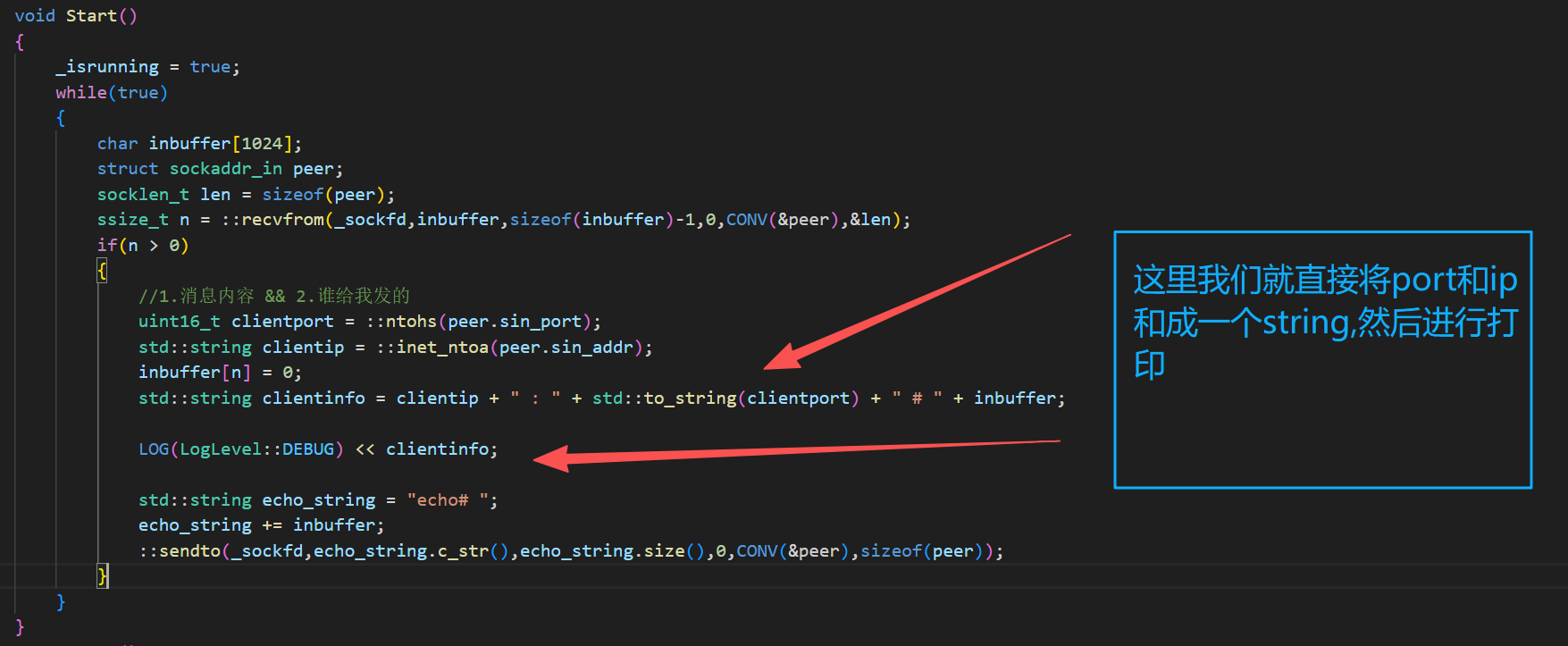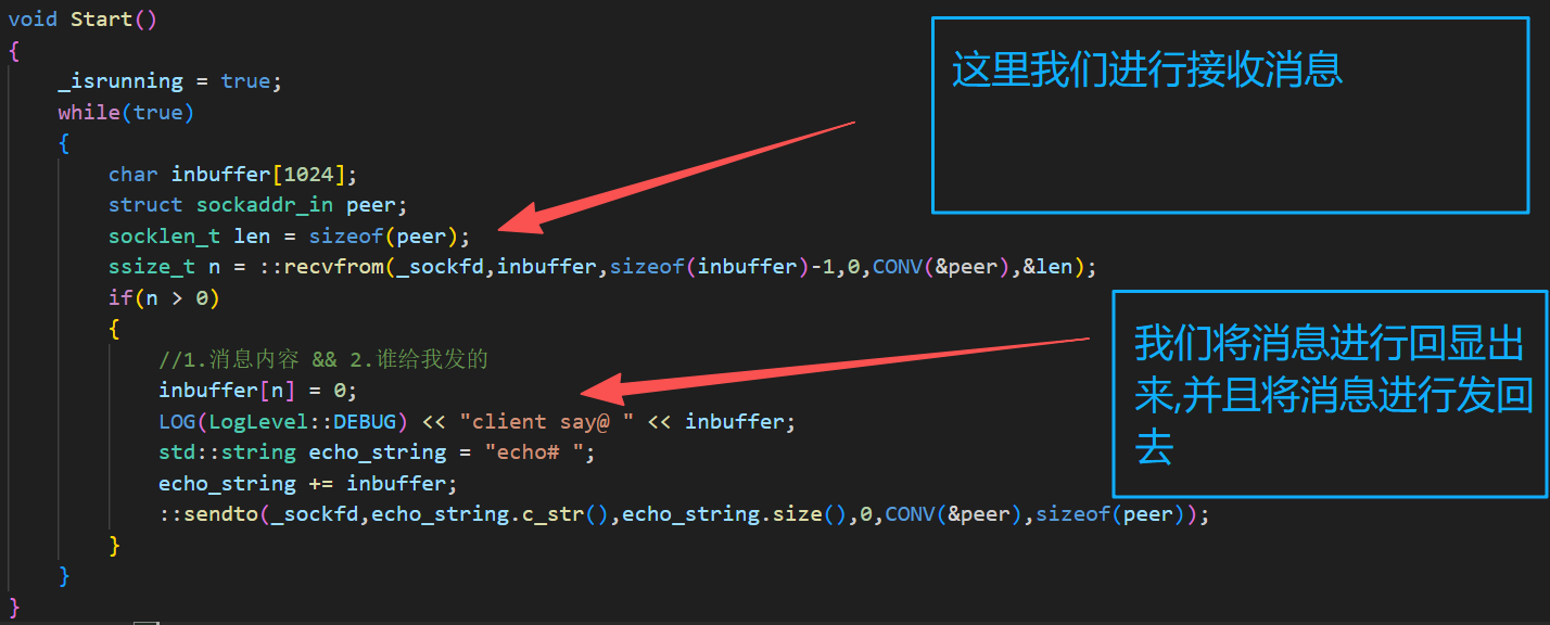 void Start(){_isrunning = true;while(true){char inbuffer[1024];struct sockaddr_in peer;socklen_t len = sizeof(peer);ssize_t n = ::recvfrom(_sockfd,inbuffer,sizeof(inbuffer)-1,0,CONV(&peer),&len);if(n > 0){//1.消息内容 && 2.谁给我发的inbuffer[n] = 0;LOG(LogLevel::DEBUG) << "client say@ " << inbuffer;std::string echo_string = "echo# ";echo_string += inbuffer;::sendto(_sockfd,echo_string.c_str(),echo_string.size(),0,CONV(&peer),sizeof(peer));}}}