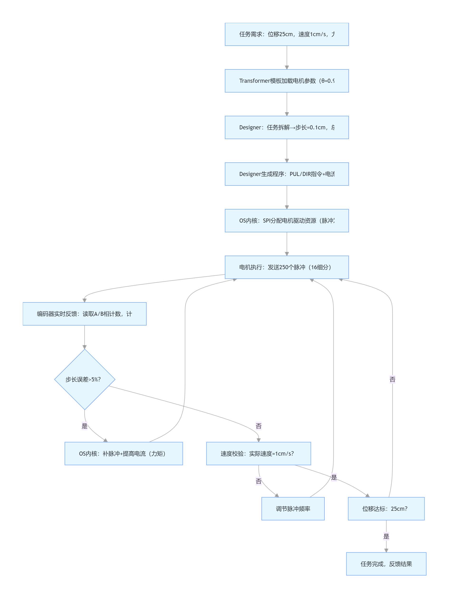 import timedef execute_task():step_size = {decomposed_task['step_size']}total_steps = {decomposed_task['total_steps']}min_step_time = {decomposed_task['min_step_time']}current_pos = 10.0 # 初始位置for step in range(total_steps):# 模拟伺服电机执行步幅(实际为末端设备控制指令)current_pos += step_sizeprint(f"执行第{{step+1}}步:步幅{{step_size}}cm,当前位置{{current_pos}}cm")time.sleep(min_step_time) # 按架构规则控制时间步return {{"task_id": {decomposed_task['task_id']},"final_pos": current_pos,"total_steps": total_steps,"status": "completed"}}# 程序入口(OS内核直接调用)
