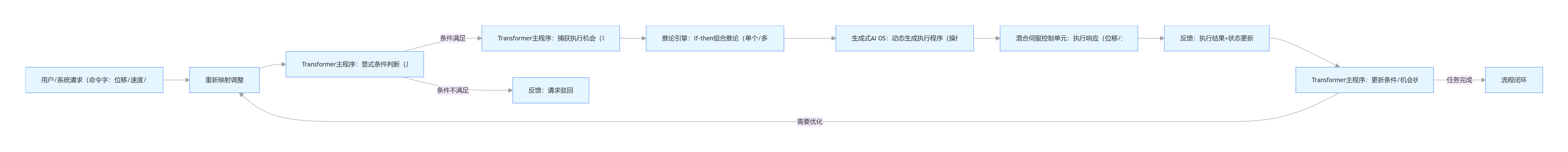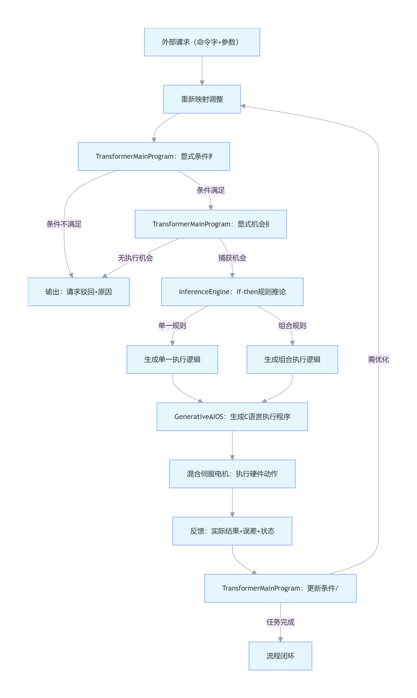 graph LRA[任务需求(如“位移25cm”)] --> B[Transformer designer(外挂AI系统)]B -->|1. 输出:执行程序+架构规则| C[OS内核(内嵌AI芯片)]C -->|2. 加载程序+按规则调度| D[末端设备执行动作]D -->|3. 反馈实时状态(当前位置/执行耗时)| CC -->|4. 反馈运行数据(精度/资源占用)| BB -->|5. 优化程序/规则| C(下一轮执行)