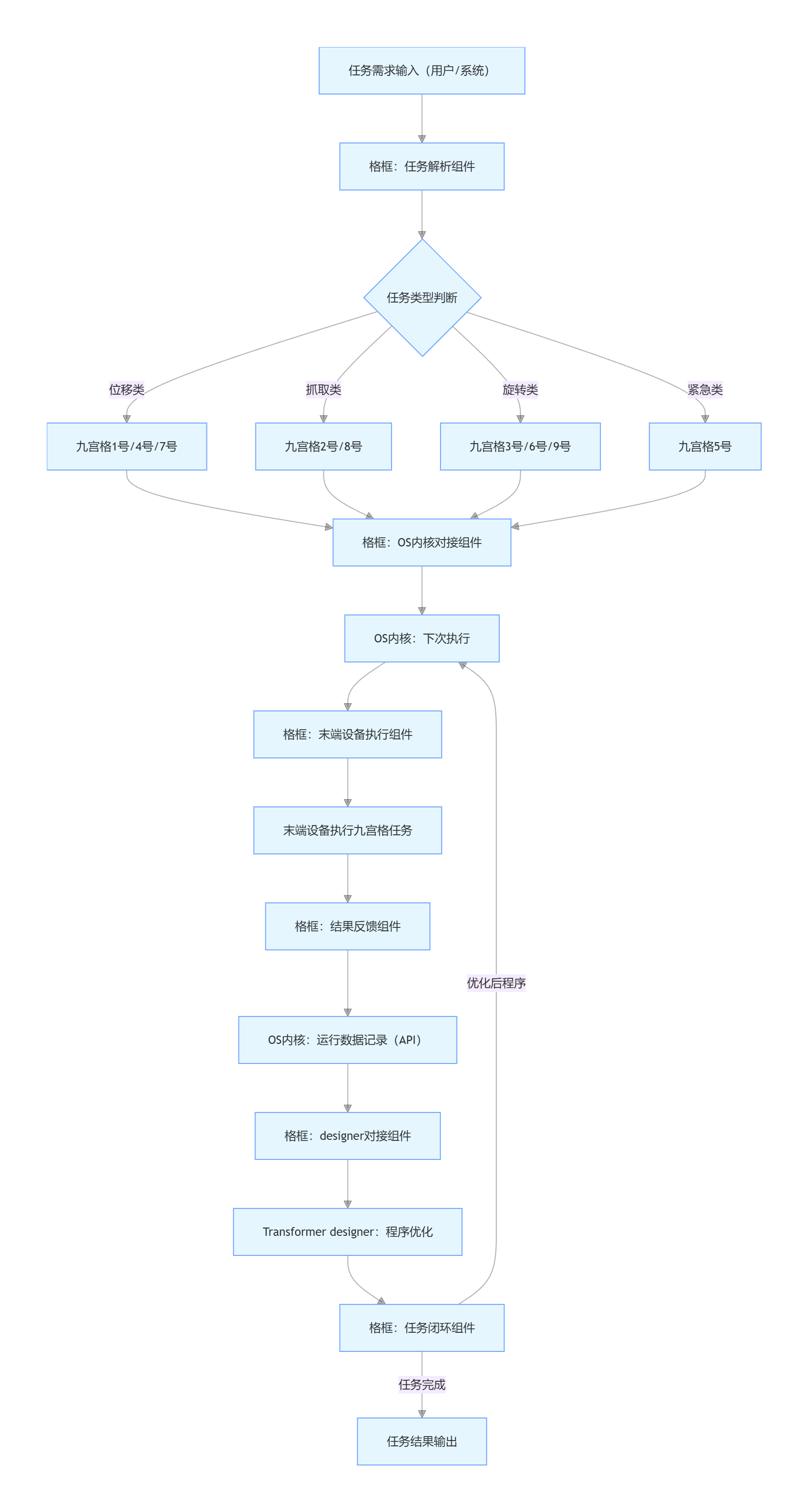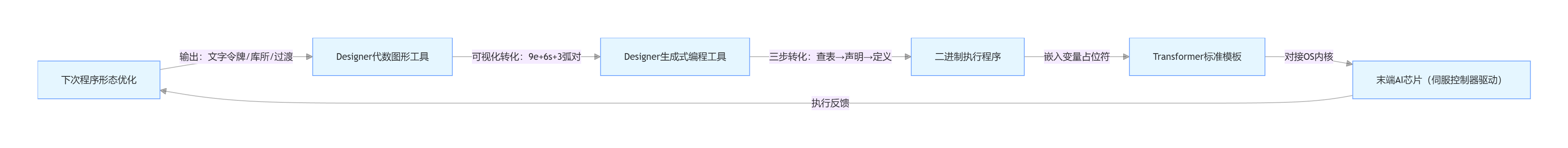 还要呼应之前的设计:Transformer 九宫格是 designer 生成程序的核心依据(比如 1 号模块对应精准位移程序),OS 内核的三大职能(组织者 / 管理者 / 服务者)是调度和支撑这些程序的基础,接口层是两者交互的桥梁,模板文件是两者共用的 “标准契约”(designer 按模板生成,OS 按模板解析)。