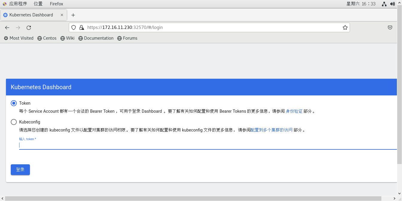 修改完之后再次查看service就会看到类型已经变成了NodePort,而且端口也多出来了一个,后面就是对外访问的服务端口,我们可以通过:节点IP:32570去访问到dashboard页面服务了;dashboard需要使用https访问,自带的证书在最新的chrome、edge浏览器中不受信,且界面无法手动进行确认继续。使用firefox访问可以在界面操作确认继续。