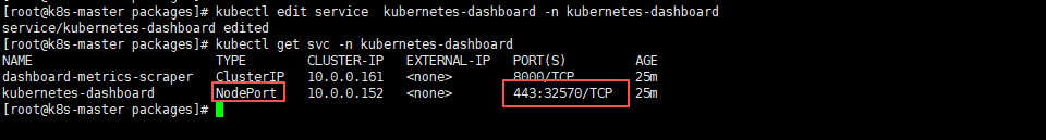 [root@k8s-master packages]# kubectl edit service kubernetes-dashboard -n kubernetes-dashboard