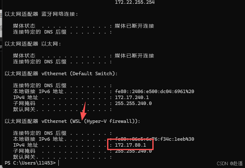 打开powershell终端,输入ipconfig,找到wsl的以太网ipv4地址: