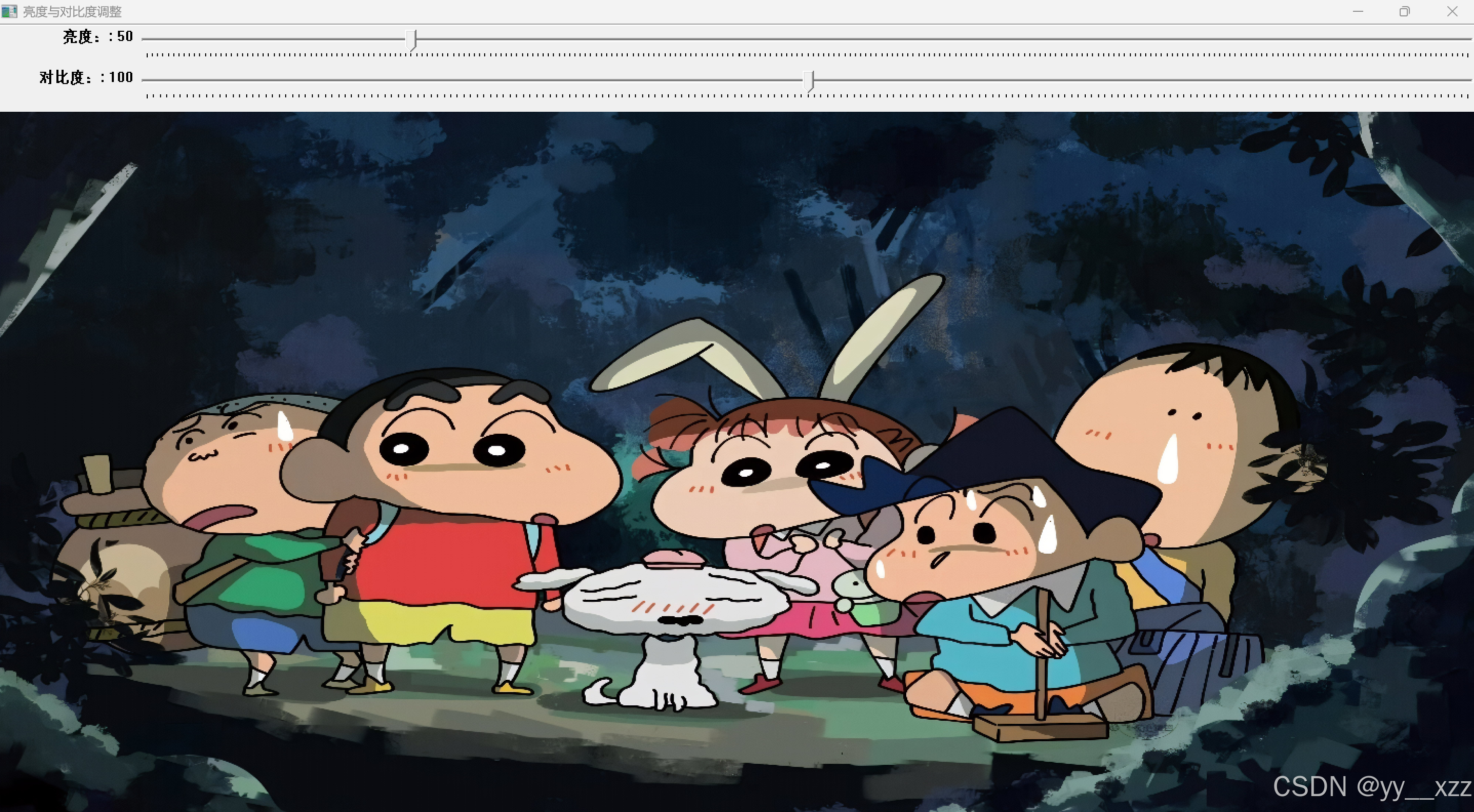 }int main() {// 加载图像Mat image = imread(picpath);if (image.empty()) {std::cout << "无法加载图像!" << std::endl;return -1;}// 创建窗口namedWindow("亮度与对比度调整", WINDOW_NORMAL);resizeWindow("亮度与对比度调整", image.cols, image.rows);// 创建亮度滑动条int lightness = 50;int max_value = 250;createTrackbar("亮度:", "亮度与对比度调整", &lightness, max_value, on_lightness, (void*)(&image));// 创建对比度滑动条int contrast_value = 100;createTrackbar("对比度:", "亮度与对比度调整", &contrast_value, 200, on_contrast, (void*)(&image));// 初始亮度和对比度调整on_lightness(50, &image);on_contrast(100, &image);waitKey(0); // 等待用户按键return 0;