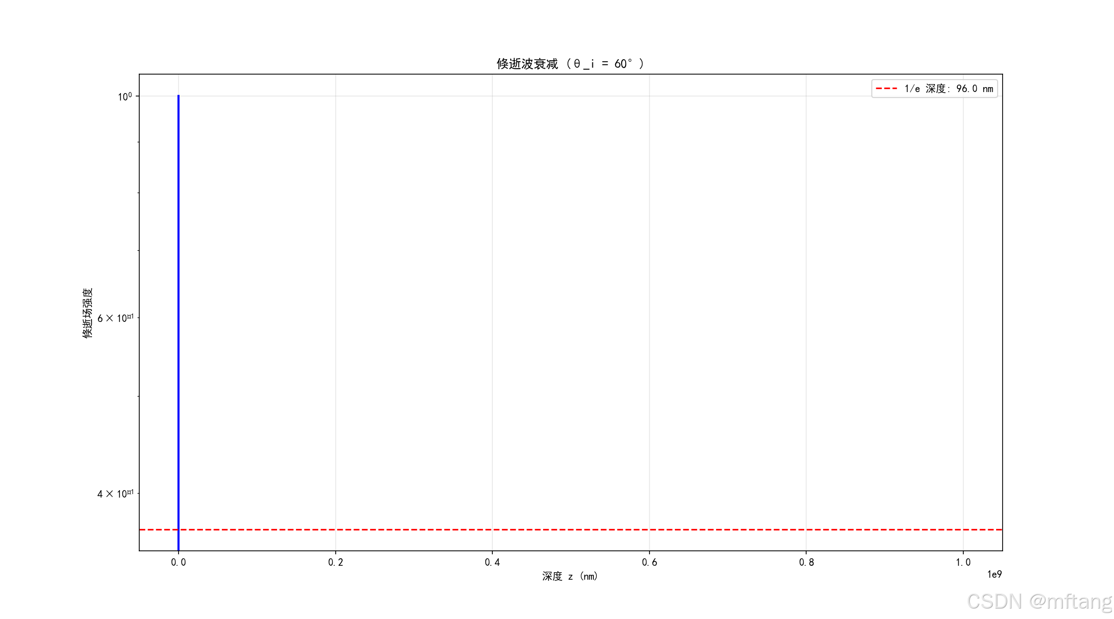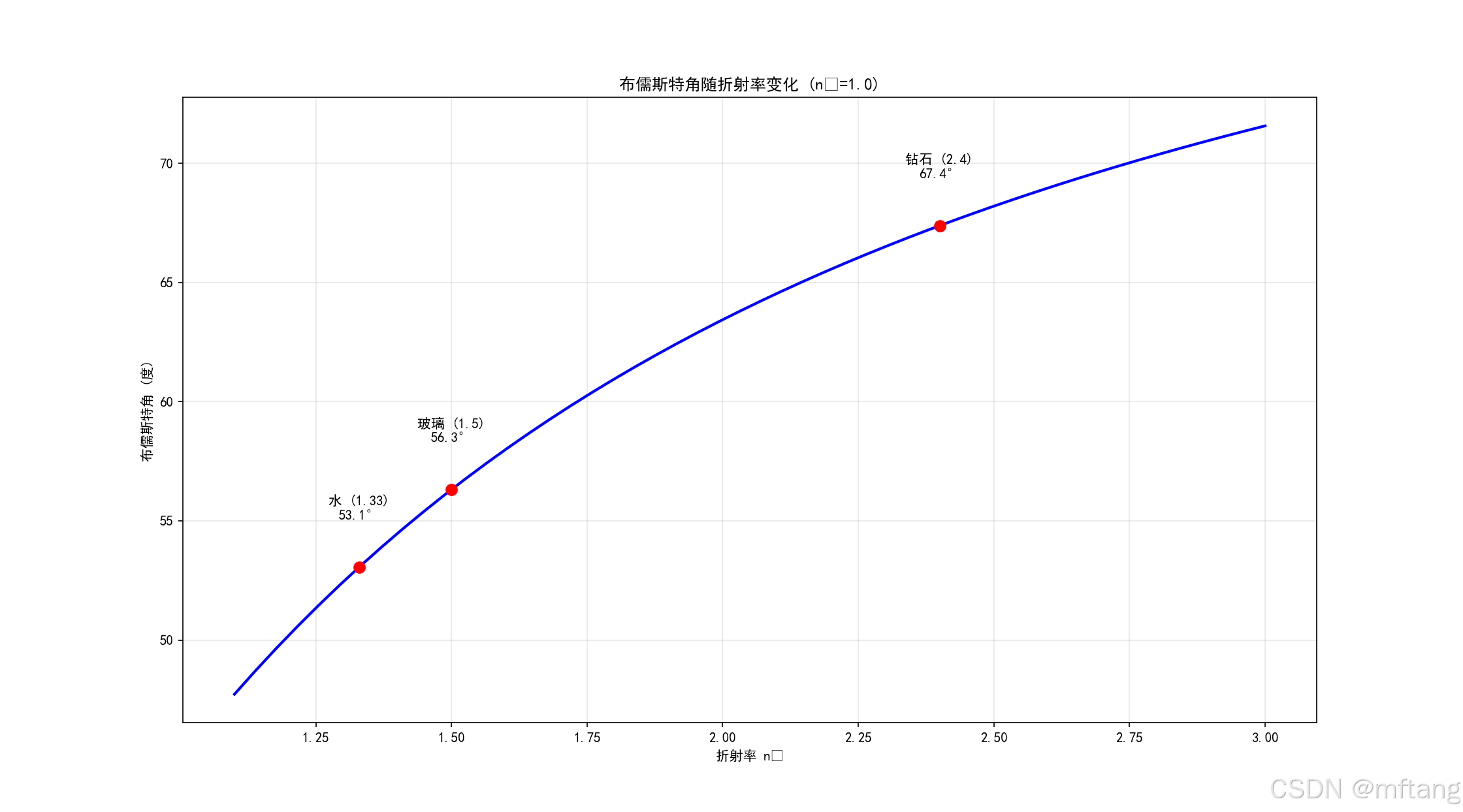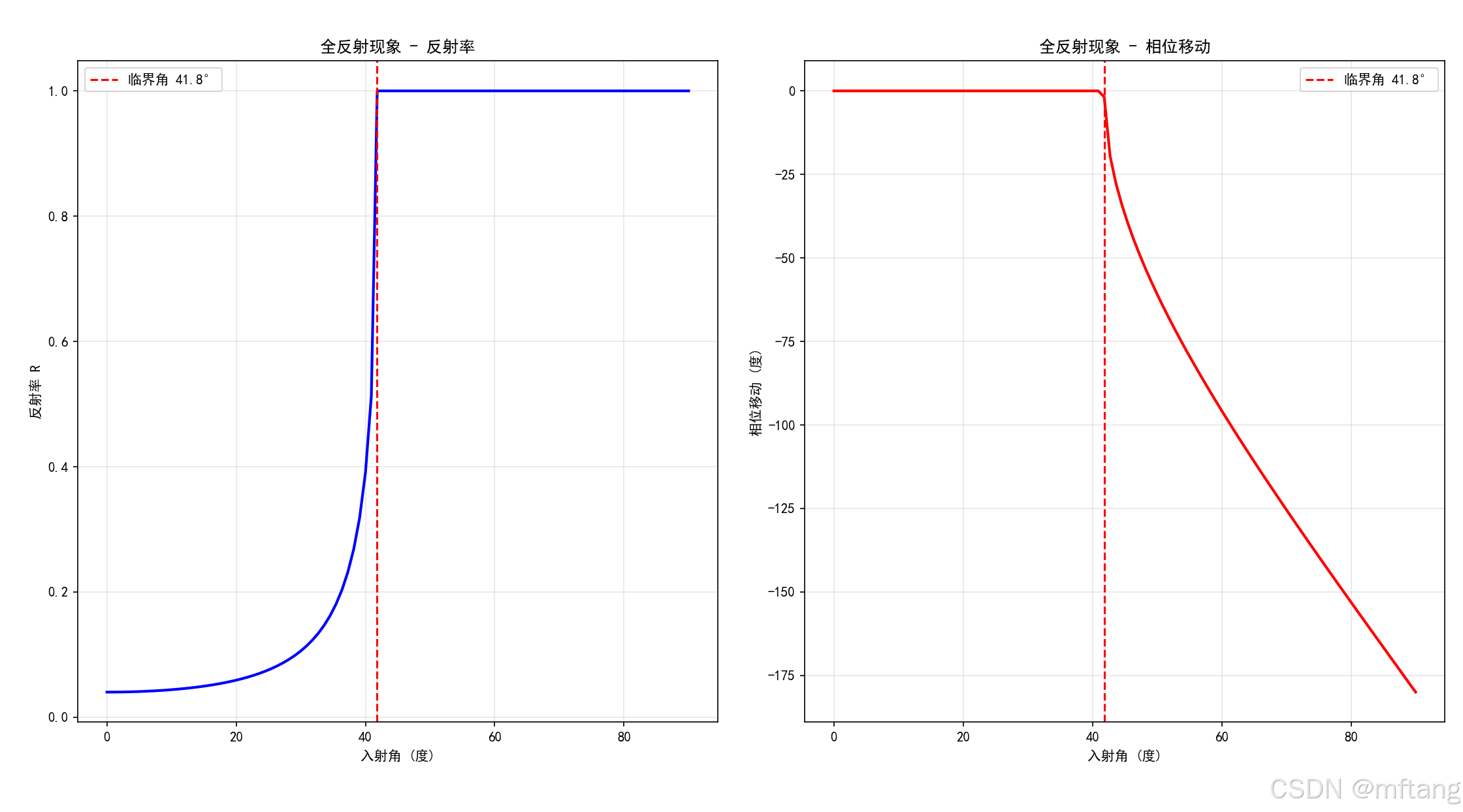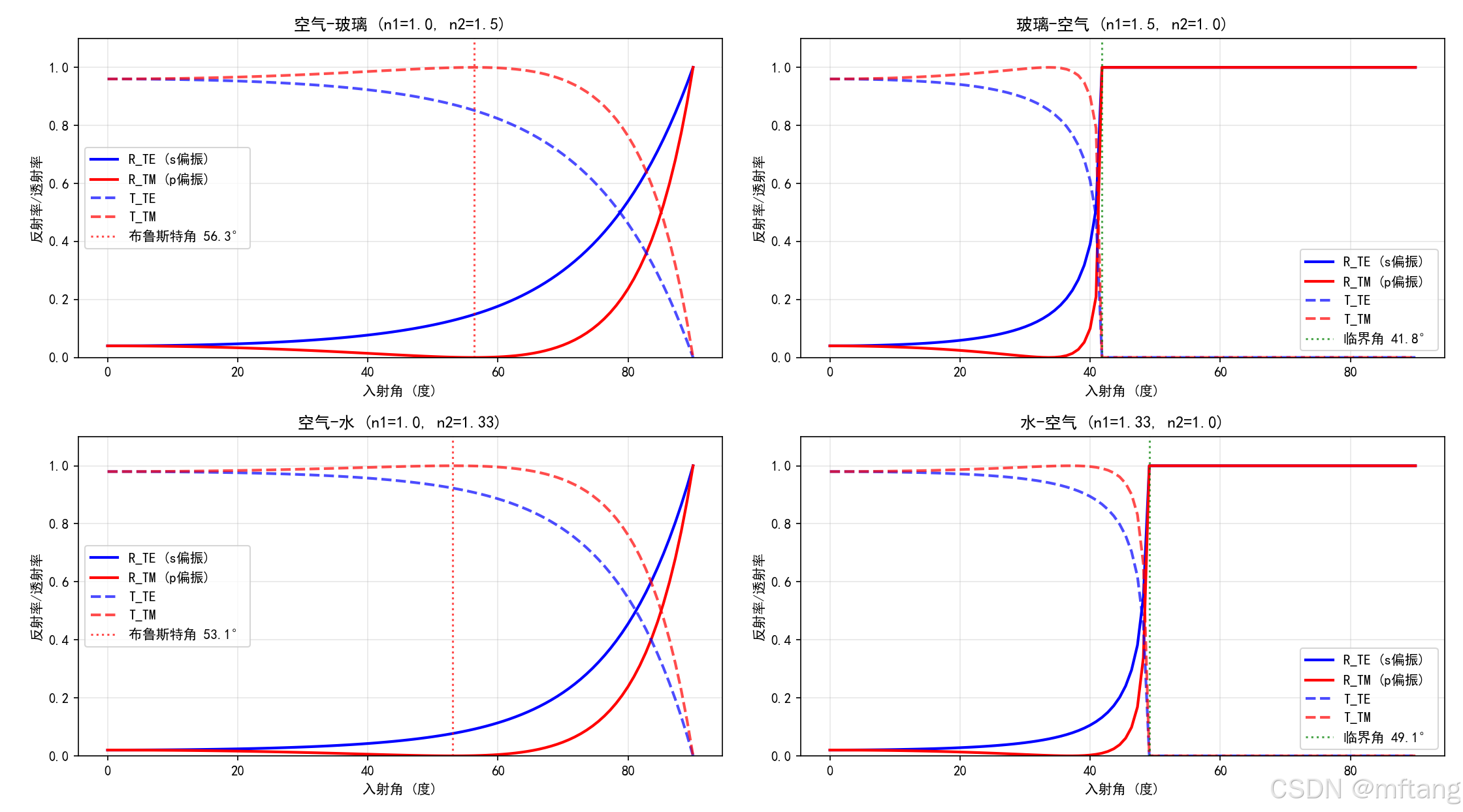 def reflection_refraction():"""电磁波的反射和折射"""def fresnel_coefficients(n1, n2, theta_i, polarization='TE'):"""菲涅耳系数计算n1, n2: 折射率theta_i: 入射角 (弧度)polarization: 'TE' (s偏振) 或 'TM' (p偏振)"""# 斯涅尔定律theta_t = np.arcsin(n1 * np.sin(theta_i) / n2) if n1 * np.sin(theta_i) / n2 <= 1 else np.pi/2if polarization == 'TE':# s偏振r = (n1 * np.cos(theta_i) - n2 * np.cos(theta_t)) / (n1 * np.cos(theta_i) + n2 * np.cos(theta_t))t = (2 * n1 * np.cos(theta_i)) / (n1 * np.cos(theta_i) + n2 * np.cos(theta_t))else:# p偏振r = (n2 * np.cos(theta_i) - n1 * np.cos(theta_t)) / (n2 * np.cos(theta_i) + n1 * np.cos(theta_t))t = (2 * n1 * np.cos(theta_i)) / (n2 * np.cos(theta_i) + n1 * np.cos(theta_t))return r, t, theta_tdef reflectance_transmittance(r, t, n1, n2, theta_i, theta_t, polarization='TE'):"""反射率和透射率"""R = np.abs(r)**2if polarization == 'TE':T = (n2 * np.cos(theta_t) / (n1 * np.cos(theta_i))) * np.abs(t)**2else:T = (n2 * np.cos(theta_t) / (n1 * np.cos(theta_i))) * np.abs(t)**2return R, T# 不同介质界面的反射折射interfaces = [{'name': '空气-玻璃', 'n1': 1.0, 'n2': 1.5},{'name': '玻璃-空气', 'n1': 1.5, 'n2': 1.0},{'name': '空气-水', 'n1': 1.0, 'n2': 1.33},{'name': '水-空气', 'n1': 1.33, 'n2': 1.0}]# 入射角范围theta_i_deg = np.linspace(0, 90, 100)theta_i_rad = np.radians(theta_i_deg)fig, axes = plt.subplots(2, 2, figsize=(12, 8))for i, interface in enumerate(interfaces):n1, n2 = interface['n1'], interface['n2']# 计算不同偏振的反射率R_TE = []R_TM = []T_TE = []T_TM = []critical_angle = Nonefor theta_i in theta_i_rad:# 检查全反射if n1 > n2 and theta_i > np.arcsin(n2/n1):R_TE.append(1.0)R_TM.append(1.0)T_TE.append(0.0)T_TM.append(0.0)if critical_angle is None:critical_angle = np.degrees(theta_i)else:r_te, t_te, theta_t_te = fresnel_coefficients(n1, n2, theta_i, 'TE')r_tm, t_tm, theta_t_tm = fresnel_coefficients(n1, n2, theta_i, 'TM')R_te, T_te = reflectance_transmittance(r_te, t_te, n1, n2, theta_i, theta_t_te, 'TE')R_tm, T_tm = reflectance_transmittance(r_tm, t_tm, n1, n2, theta_i, theta_t_tm, 'TM')R_TE.append(R_te)R_TM.append(R_tm)T_TE.append(T_te)T_TM.append(T_tm)row, col = i // 2, i % 2# 绘制反射率axes[row, col].plot(theta_i_deg, R_TE, 'b-', linewidth=2, label='R_TE (s偏振)')axes[row, col].plot(theta_i_deg, R_TM, 'r-', linewidth=2, label='R_TM (p偏振)')axes[row, col].plot(theta_i_deg, T_TE, 'b--', linewidth=2, label='T_TE', alpha=0.7)axes[row, col].plot(theta_i_deg, T_TM, 'r--', linewidth=2, label='T_TM', alpha=0.7)# 标记布鲁斯特角 (p偏振反射率为0)if n1 < n2: # 从光疏到光密brewster_angle = np.degrees(np.arctan(n2/n1))axes[row, col].axvline(x=brewster_angle, color='red', linestyle=':', alpha=0.7, label=f'布鲁斯特角 {brewster_angle:.1f}°')# 标记临界角if critical_angle is not None:axes[row, col].axvline(x=critical_angle, color='green', linestyle=':', alpha=0.7, label=f'临界角 {critical_angle:.1f}°')axes[row, col].set_xlabel('入射角 (度)')axes[row, col].set_ylabel('反射率/透射率')axes[row, col].set_title(f'{interface["name"]} (n1={n1}, n2={n2})')axes[row, col].legend()axes[row, col].grid(True, alpha=0.3)axes[row, col].set_ylim(0, 1.1)plt.tight_layout()plt.show()# 布儒斯特角详细分析print("布儒斯特角分析:")n2_values = np.linspace(1.1, 3.0, 50)brewster_angles = np.degrees(np.arctan(n2_values)) # n1=1.0plt.figure(figsize=(10, 6))plt.plot(n2_values, brewster_angles, 'b-', linewidth=2)plt.xlabel('折射率 n₂')plt.ylabel('布儒斯特角 (度)')plt.title('布儒斯特角随折射率变化 (n₁=1.0)')plt.grid(True, alpha=0.3)# 标记常见材料common_materials = {'水 (1.33)': 1.33,'玻璃 (1.5)': 1.5,'钻石 (2.4)': 2.4}for name, n in common_materials.items():angle = np.degrees(np.arctan(n))plt.plot(n, angle, 'ro', markersize=8)plt.text(n, angle + 2, f'{name}\n{angle:.1f}°', ha='center', fontsize=10)plt.show()return interfacesdef total_internal_reflection():"""全反射现象"""# 从光密到光疏介质n1, n2 = 1.5, 1.0 # 玻璃到空气critical_angle = np.degrees(np.arcsin(n2/n1))print(f"临界角: {critical_angle:.2f}°")# 入射角范围theta_i_deg = np.linspace(0, 90, 100)theta_i_rad = np.radians(theta_i_deg)# 计算反射系数(复数,用于全反射情况)def complex_fresnel_TE(n1, n2, theta_i):"""全反射情况下的复数菲涅耳系数 (TE)"""sin_theta_t = n1 * np.sin(theta_i) / n2if sin_theta_t <= 1:# 正常折射theta_t = np.arcsin(sin_theta_t)r = (n1 * np.cos(theta_i) - n2 * np.cos(theta_t)) / (n1 * np.cos(theta_i) + n2 * np.cos(theta_t))return r, 0else:# 全反射cos_theta_t = 1j * np.sqrt(sin_theta_t**2 - 1) # 虚数r = (n1 * np.cos(theta_i) - n2 * cos_theta_t) / (n1 * np.cos(theta_i) + n2 * cos_theta_t)phase_shift = np.angle(r)return np.abs(r), phase_shift# 计算反射系数和相位移动R_TE = []phase_TE = []for theta_i in theta_i_rad:r_mag, phase = complex_fresnel_TE(n1, n2, theta_i)R_TE.append(r_mag**2)phase_TE.append(phase)# 绘制结果fig, (ax1, ax2) = plt.subplots(1, 2, figsize=(12, 5))# 反射率ax1.plot(theta_i_deg, R_TE, 'b-', linewidth=2)ax1.axvline(x=critical_angle, color='red', linestyle='--', label=f'临界角 {critical_angle:.1f}°')ax1.set_xlabel('入射角 (度)')ax1.set_ylabel('反射率 R')ax1.set_title('全反射现象 - 反射率')ax1.legend()ax1.grid(True, alpha=0.3)# 相位移动ax2.plot(theta_i_deg, np.degrees(phase_TE), 'r-', linewidth=2)ax2.axvline(x=critical_angle, color='red', linestyle='--', label=f'临界角 {critical_angle:.1f}°')ax2.set_xlabel('入射角 (度)')ax2.set_ylabel('相位移动 (度)')ax2.set_title('全反射现象 - 相位移动')ax2.legend()ax2.grid(True, alpha=0.3)plt.tight_layout()plt.show()# 倏逝波分析print("\n倏逝波分析:")z = np.linspace(0, 1, 200) # 进入第二介质的深度theta_i_example = np.radians(60) # 大于临界角的入射角# 衰减常数k0 = 2 * np.pi / (500e-9) # 假设波长500nmkappa = k0 * n1 * np.sqrt(np.sin(theta_i_example)**