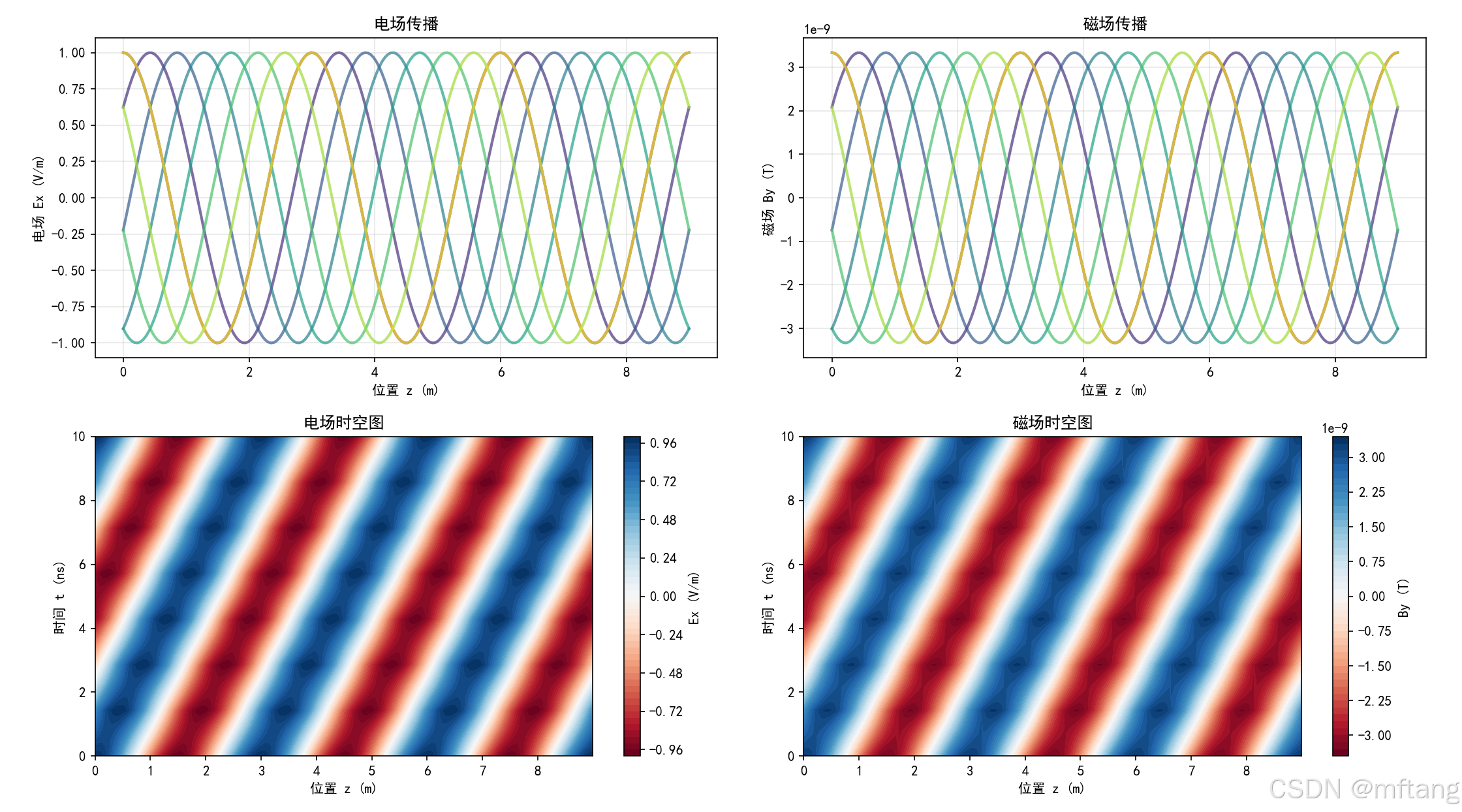 电磁波传播理论的数学原理深邃而优美,其核心是麦克斯韦方程组。一切电磁现象的起点都是这组由詹姆斯·克拉克·麦克斯韦在19世纪总结的四个方程。它们描述了电场 (E) 和磁场 (B) 是如何由电荷和电流产生,以及它们之间如何相互作用的。本文介绍电磁波传播的基本理论,并提供相应的Python实现。