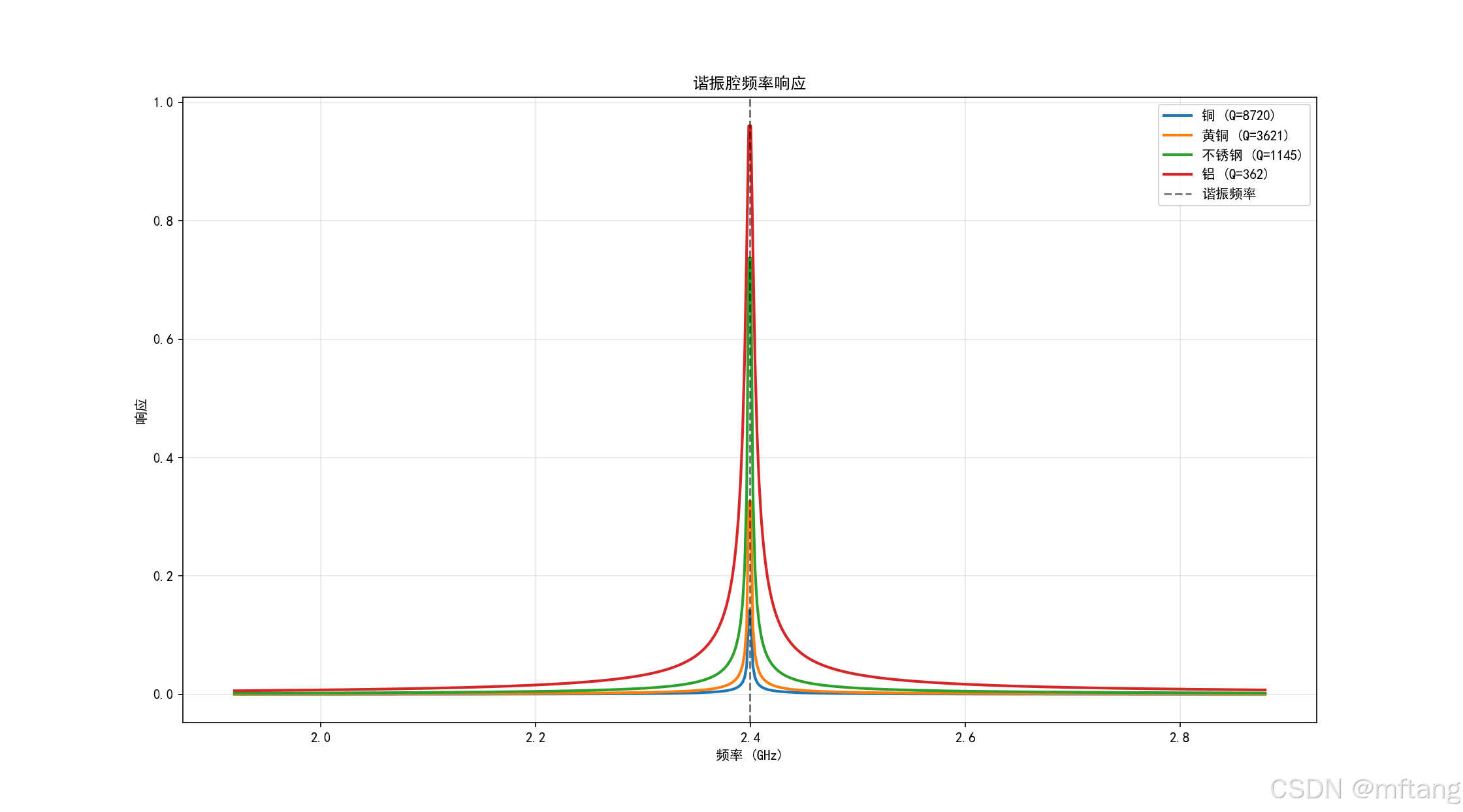 def waveguide_modes():"""波导模式分析"""def rectangular_waveguide_modes(a, b, f, m, n, epsilon_r=1.0, mu_r=1.0):"""矩形波导模式分析a, b: 波导尺寸 (m)f: 频率 (Hz)m, n: 模式指数"""c = constants.c / np.sqrt(epsilon_r * mu_r)k = 2 * np.pi * f / c# 截止波数kc = np.sqrt((m * np.pi / a)**2 + (n * np.pi / b)**2)# 截止频率fc = c * kc / (2 * np.pi)# 传播常数if f > fc:beta = np.sqrt(k**2 - kc**2) # 传播模式gamma = 1j * beta # 传播常数else:beta = 0gamma = np.sqrt(kc**2 - k**2) # 衰减模式# 波导波长lambda_g = 2 * np.pi / beta if beta > 0 else float('inf')# 相速度vp = c / np.sqrt(1 - (fc/f)**2) if f > fc else float('inf')# 群速度vg = c * np.sqrt(1 - (fc/f)**2) if f > fc else 0return {'cutoff_frequency': fc,'propagation_constant': beta,'guide_wavelength': lambda_g,'phase_velocity': vp,'group_velocity': vg}# 标准矩形波导 (WR-90)a = 22.86e-3 # 宽边尺寸b = 10.16e-3 # 窄边尺寸print(f"矩形波导 WR-90:")print(f"尺寸: {a*1000:.2f} × {b*1000:.2f} mm")# 不同模式的截止频率modes = [(1,0), (2,0), (0,1), (1,1), (2,1), (3,0)]print("\n模式截止频率:")for m, n in modes:if m == 0 and n == 0:continue # TEM模在波导中不存在mode_info = rectangular_waveguide_modes(a, b, 10e9, m, n)print(f"TE{m}{n}模: fc = {mode_info['cutoff_frequency']/1e9:.2f} GHz")# 色散关系frequencies = np.linspace(1e9, 20e9, 200)plt.figure(figsize=(12, 8))for m, n in [(1,0), (2,0), (0,1)]:vp_list = []vg_list = []lambda_g_list = []for f in frequencies:mode_info = rectangular_waveguide_modes(a, b, f, m, n)vp_list.append(mode_info['phase_velocity'])vg_list.append(mode_info['group_velocity'])lambda_g_list.append(mode_info['guide_wavelength'])# 标记截止频率fc = rectangular_waveguide_modes(a, b, 10e9, m, n)['cutoff_frequency']plt.subplot(2, 2, 1)plt.plot(frequencies/1e9, np.array(vp_list)/1e6, linewidth=2, label=f'TE{m}{n}')plt.axvline(x=fc/1e9, linestyle='--', alpha=0.5)plt.subplot(2, 2, 2)plt.plot(frequencies/1e9, np.array(vg_list)/1e6, linewidth=2, label=f'TE{m}{n}')plt.axvline(x=fc/1e9, linestyle='--', alpha=0.5)plt.subplot(2, 2, 3)plt.plot(frequencies/1e9, np.array(lambda_g_list)*100, linewidth=2, label=f'TE{m}{n}')plt.axvline(x=fc/1e9, linestyle='--', alpha=0.5)plt.subplot(2, 2, 1)plt.xlabel('频率 (GHz)')plt.ylabel('相速度 (×10⁶ m/s)')plt.title('波导相速度')plt.legend()plt.grid(True, alpha=0.3)plt.subplot(2, 2, 2)plt.xlabel('频率 (GHz)')plt.ylabel('群速度 (×10⁶ m/s)')plt.title('波导群速度')plt.legend()plt.grid(True, alpha=0.3)plt.subplot(2, 2, 3)plt.xlabel('频率 (GHz)')plt.ylabel('波导波长 (cm)')plt.title('波导波长')plt.legend()plt.grid(True, alpha=0.3)# 场分布可视化 (TE10模)x = np.linspace(0, a, 50)y = np.linspace(0, b, 50)X, Y = np.meshgrid(x, y)# TE10模的电场分布E_y = np.sin(np.pi * X / a) # 只有y分量plt.subplot(2, 2, 4)plt.contourf(X*1000, Y*1000, E_y, levels=50, cmap='RdBu')plt.colorbar(label='电场 Ey')plt.xlabel('x (mm)')plt.ylabel('y (mm)')plt.title('TE10模电场分布')plt.gca().set_aspect('equal')plt.tight_layout()plt.show()return a, b, modesdef resonant_cavity():"""谐振腔分析"""def rectangular_cavity_resonance(a, b, d, m, n, p, epsilon_r=1.0, mu_r=1.0):"""矩形谐振腔谐振频率a, b, d: 腔体尺寸m, n, p: 模式指数"""c = constants.c / np.sqrt(epsilon_r * mu_r)# 谐振频率f_resonant = (c / 2) * np.sqrt((m/a)**2 + (n/b)**2 + (p/d)**2)return f_resonant# 标准谐振腔尺寸a, b, d = 10e-2, 5e-2, 8e-2 # 10cm × 5cm × 8cmprint(f"矩形谐振腔:")print(f"尺寸: {a*100:.1f} × {b*100:.1f} × {d*100:.1f} cm")# 主要模式的谐振频率cavity_modes = [(1,0,1), (0,1,1), (1,1,1), (2,0,1), (1,0,2)]print("\n谐振频率:")for m, n, p in cavity_modes:f_res = rectangular_cavity_resonance(a, b, d, m, n, p)print(f"TE{m}{n}{p}模: f = {f_res/1e9:.2f} GHz")# 品质因数计算 (简化)def cavity_Q(f_res, conductivity=5.8e7, mu_r=1.0):"""谐振腔品质因数估算"""# 对于铜壁skin_depth = 1 / np.sqrt(np.pi * f_res * constants.mu_0 * conductivity)# 体积与表面积比 (简化计算)V = a * b * dS = 2*(a*b + a*d + b*d)# 品质因数 Q ≈ (体积/表面积) / skin_depthQ = V / (S * skin_depth)return Q# 品质因数分析conductivities = [5.8e7, 1e7, 1e6, 1e5] # 不同材料的电导率materials = ['铜', '黄铜', '不锈钢', '铝']f_res_example = rectangular_cavity_resonance(a, b, d, 1, 0, 1)print(f"\nTE101模品质因数:")for cond, material in zip(conductivities, materials):Q = cavity_Q(f_res_example, conductivity=cond)print(f"{material}: Q = {Q:.0f}")# 谐振曲线frequencies = np.linspace(0.8*f_res_example, 1.2*f_res_example, 500)plt.figure(figsize=(10, 6))for cond, material in zip(conductivities, materials):Q = cavity_Q(f_res_example, conductivity=cond)# 谐振曲线 (洛伦兹型)response = 1 / np.sqrt(1 + Q**2 * ((frequencies/f_res_example) - (f_res_example/frequencies))**2)plt.plot(frequencies/1e9, response, linewidth=2, label=f'{material} (Q={Q:.0f})')plt.axvline(x=f_res_example/1e9, color='k', linestyle='--', alpha=0.5, label='谐振频率')plt.xlabel('频率 (GHz)')plt.ylabel('响应')plt.title('谐振腔频率响应')plt.legend()plt.grid(True, alpha=0.3)plt.show()return a, b, d, cavity_modes# 运行波导和谐振腔分析