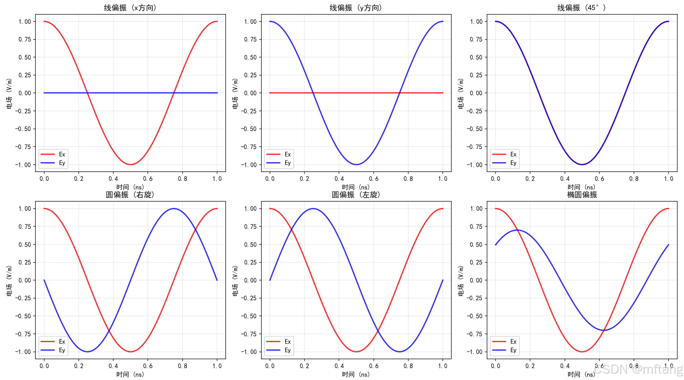 def polarization_states():"""电磁波的偏振状态"""em_wave = ElectromagneticWave(frequency=1e9, amplitude=1.0)# 时间数组t = np.linspace(0, 2 * np.pi / em_wave.omega, 100)z = 0 # 固定位置# 不同的偏振状态polarization_cases = [{'name': '线偏振 (x方向)', 'Ex_phase': 0, 'Ey_phase': 0, 'Ey_amp': 0},{'name': '线偏振 (y方向)', 'Ex_phase': 0, 'Ey_phase': 0, 'Ey_amp': 1, 'Ex_amp': 0},{'name': '线偏振 (45°)', 'Ex_phase': 0, 'Ey_phase': 0, 'Ey_amp': 1, 'Ex_amp': 1},{'name': '圆偏振 (右旋)', 'Ex_phase': 0, 'Ey_phase': -np.pi / 2, 'Ey_amp': 1, 'Ex_amp': 1},{'name': '圆偏振 (左旋)', 'Ex_phase': 0, 'Ey_phase': np.pi / 2, 'Ey_amp': 1, 'Ex_amp': 1},{'name': '椭圆偏振', 'Ex_phase': 0, 'Ey_phase': np.pi / 4, 'Ey_amp': 0.7, 'Ex_amp': 1}]fig, axes = plt.subplots(2, 3, figsize=(15, 10))axes = axes.flatten()for i, case in enumerate(polarization_cases):# 计算电场分量Ex_amp = case.get('Ex_amp', 1)Ey_amp = case.get('Ey_amp', 1)Ex_phase = case.get('Ex_phase', 0)Ey_phase = case.get('Ey_phase', 0)Ex = Ex_amp * em_wave.E0 * np.cos(em_wave.k * z - em_wave.omega * t + Ex_phase)Ey = Ey_amp * em_wave.E0 * np.cos(em_wave.k * z - em_wave.omega * t + Ey_phase)# 时间序列axes[i].plot(t * 1e9, Ex, 'r-', linewidth=2, label='Ex', alpha=0.8)axes[i].plot(t * 1e9, Ey, 'b-', linewidth=2, label='Ey', alpha=0.8)axes[i].set_xlabel('时间 (ns)')axes[i].set_ylabel('电场 (V/m)')axes[i].set_title(case['name'])axes[i].legend()axes[i].grid(True, alpha=0.3)plt.tight_layout()plt.show()# 偏振轨迹fig, axes = plt.subplots(2, 3, figsize=(15, 10))axes = axes.flatten()for i, case in enumerate(polarization_cases):# 计算电场分量Ex_amp = case.get('Ex_amp', 1)Ey_amp = case.get('Ey_amp', 1)Ex_phase = case.get('Ex_phase', 0)Ey_phase = case.get('Ey_phase', 0)Ex = Ex_amp * em_wave.E0 * np.cos(em_wave.k * z - em_wave.omega * t + Ex_phase)Ey = Ey_amp * em_wave.E0 * np.cos(em_wave.k * z - em_wave.omega * t + Ey_phase)# 偏振轨迹axes[i].plot(Ex, Ey, 'purple', linewidth=2)axes[i].set_xlabel('Ex (V/m)')axes[i].set_ylabel('Ey (V/m)')axes[i].set_title(f"{case['name']} - 偏振轨迹")axes[i].grid(True, alpha=0.3)axes[i].set_aspect('equal')# 标记起点axes[i].plot(Ex[0], Ey[0], 'ro', markersize=8)plt.tight_layout()plt.show()# 斯托克斯参数分析def stokes_parameters(Ex, Ey, phase_diff):"""计算斯托克斯参数"""I = Ex ** 2 + Ey ** 2 # 总强度Q = Ex ** 2 - Ey ** 2 # 线偏振程度U = 2 * Ex * Ey * np.cos(phase_diff) # 45°线偏振V = 2 * Ex * Ey * np.sin(phase_diff) # 圆偏振return I, Q, U, Vprint("斯托克斯参数分析:")for case in polarization_cases:Ex_amp = case.get('Ex_amp', 1)Ey_amp = case.get('Ey_amp', 1)phase_diff = case.get('Ey_phase', 0) - case.get('Ex_phase', 0)I, Q, U, V = stokes_parameters(Ex_amp, Ey_amp, phase_diff)print(f"{case['name']}:")print(f" I={I:.2f}, Q={Q:.2f}, U={U:.2f}, V={V:.2f}")print(f" 偏振度: {np.sqrt(Q ** 2 + U ** 2 + V ** 2) / I:.2f}")return polarization_cases# 运行偏振状态分析