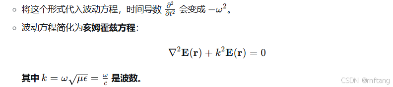 对于时谐场,波动方程简化为亥姆霍兹方程,便于分析空间模式。
