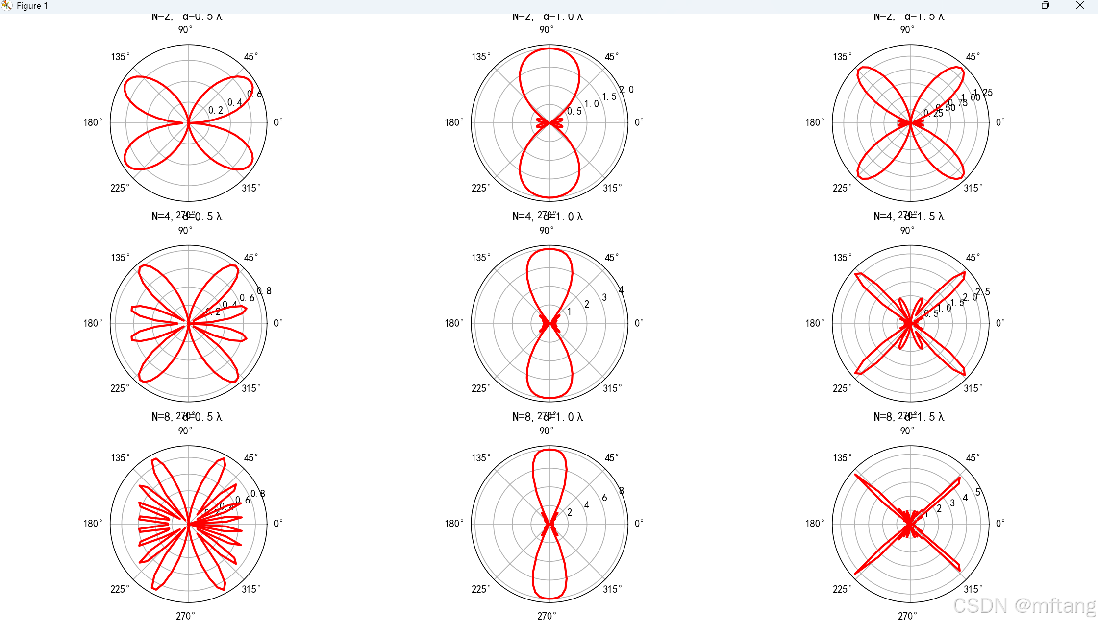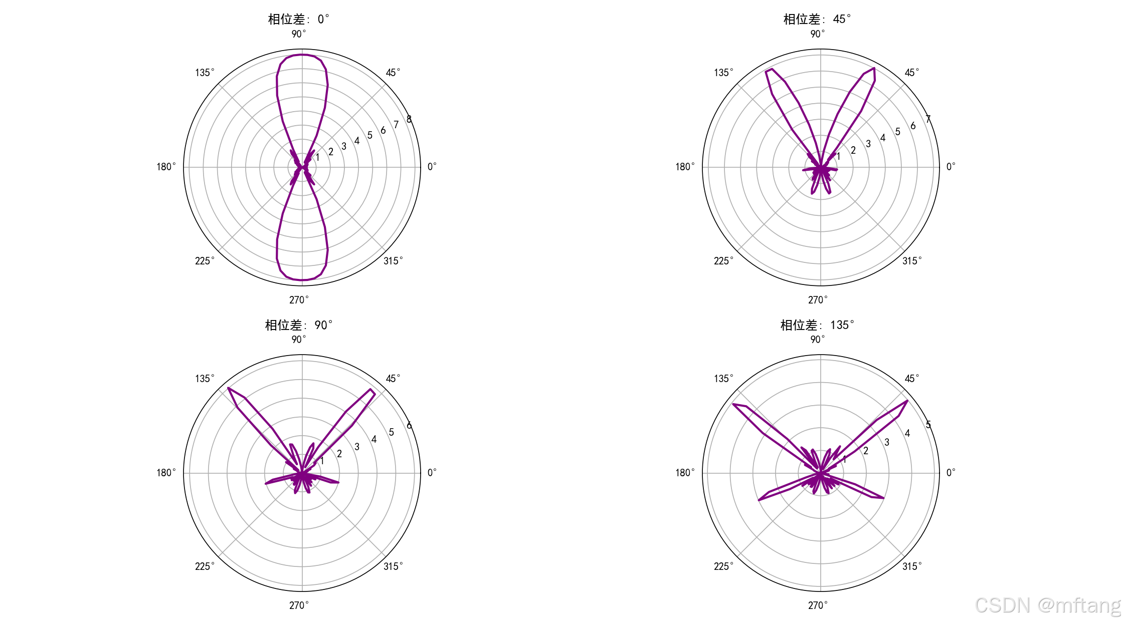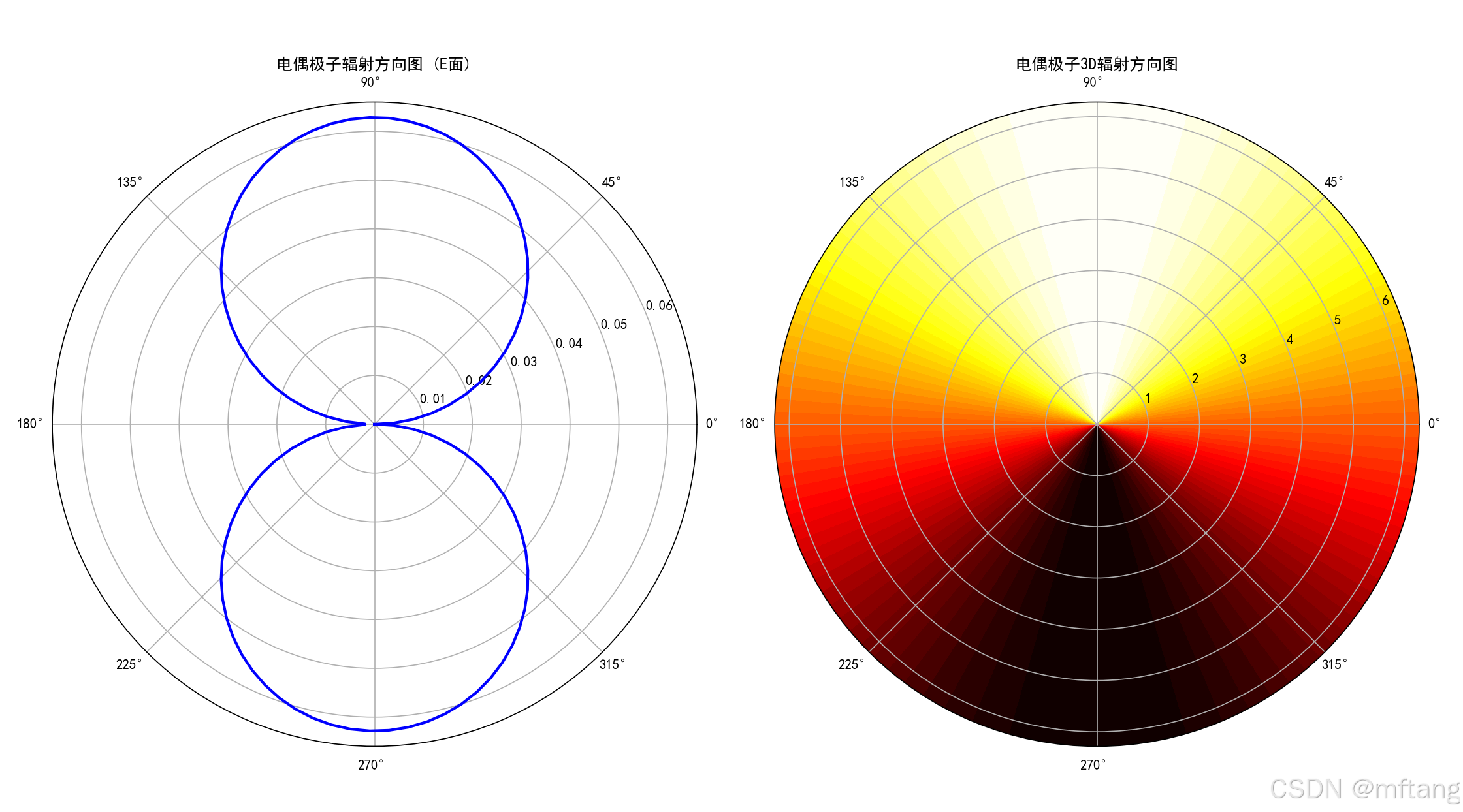 def antenna_radiation():"""天线辐射分析"""def dipole_radiation_pattern(I, l, f, r, theta):"""电偶极子辐射场I: 电流 (A)l: 偶极子长度 (m)f: 频率 (Hz)r: 距离 (m)theta: 角度 (弧度)"""c = constants.ck = 2 * np.pi * f / ceta = np.sqrt(constants.mu_0 / constants.epsilon_0) # 自由空间阻抗# 远场近似E_theta = (1j * eta * k * I * l / (4 * np.pi * r)) * np.sin(theta) * np.exp(-1j * k * r)H_phi = E_theta / etareturn np.abs(E_theta), np.abs(H_phi)def antenna_array_factor(N, d, theta, phi, f, phase_diff=0):"""天线阵列因子N: 天线数量d: 天线间距theta, phi: 观察方向phase_diff: 相邻天线相位差"""c = constants.ck = 2 * np.pi * f / cpsi = k * d * np.sin(theta) * np.cos(phi) + phase_diffif N == 1:return 1else:if np.abs(psi) < 1e-10:return Nelse:return np.abs(np.sin(N * psi / 2) / np.sin(psi / 2))# 单偶极子辐射方向图I = 1.0 # 电流l = 0.1 # 偶极子长度f = 100e6 # 频率r = 100 # 观察距离theta = np.linspace(0, 2*np.pi, 100)E_pattern = []for th in theta:E, H = dipole_radiation_pattern(I, l, f, r, th)E_pattern.append(E)# 极坐标图fig, axes = plt.subplots(1, 2, figsize=(12, 5), subplot_kw={'projection': 'polar'})# 电场方向图axes[0].plot(theta, E_pattern, 'b-', linewidth=2)axes[0].set_title('电偶极子辐射方向图 (E面)')axes[0].grid(True)# 3D方向图theta_3d = np.linspace(0, 2*np.pi, 50)phi_3d = np.linspace(0, 2*np.pi, 50)Theta, Phi = np.meshgrid(theta_3d, phi_3d)# 偶极子在z方向,辐射方向图与phi无关R = np.sin(Theta)axes[1].contourf(Theta, Phi, R, levels=50, cmap='hot')axes[1].set_title('电偶极子3D辐射方向图')plt.tight_layout()plt.show()# 天线阵列分析print("天线阵列分析:")N_values = [2, 4, 8] # 天线数量d_values = [0.5, 1.0, 1.5] # 间距 (以波长为单位)wavelength = constants.c / ffig, axes = plt.subplots(3, 3, figsize=(15, 12), subplot_kw={'projection': 'polar'})for i, N in enumerate(N_values):for j, d_ratio in enumerate(d_values):d = d_ratio * wavelengtharray_pattern = []for th in theta:af = antenna_array_factor(N, d, th, 0, f)# 假设单元方向图为偶极子element_pattern = np.sin(th) if th <= np.pi else np.sin(2*np.pi - th)total_pattern = af * element_patternarray_pattern.append(total_pattern)axes[i, j].plot(theta, array_pattern, 'r-', linewidth=2)axes[i, j].set_title(f'N={N}, d={d_ratio}λ')axes[i, j].grid(True)plt.tight_layout()plt.show()# 波束扫描print("\n相控阵波束扫描:")phase_shifts = [0, np.pi/4, np.pi/2, 3*np.pi/4]plt.figure(figsize=(12, 8))for i, phase_shift in enumerate(phase_shifts):array_pattern = []for th in theta:af = antenna_array_factor(8, wavelength, th, 0, f, phase_shift)element_pattern = np.sin(th) if th <= np.pi else np.sin(2*np.pi - th)total_pattern = af * element_patternarray_pattern.append(total_pattern)plt.subplot(2, 2, i+1, projection='polar')plt.plot(theta, array_pattern, 'purple', linewidth=2)plt.title(f'相位差: {np.degrees(phase_shift):.0f}°')plt.grid(True)plt.tight_layout()plt.show()# 天线增益和方向性def antenna_directivity(radiation_pattern, theta):"""计算天线方向性"""# 总辐射功率total_power = np.trapz(radiation_pattern**2 * np.sin(theta), theta)# 最大辐射强度max_intensity = np.max(radiation_pattern**2)# 方向性 D = 4π * 最大辐射强度 / 总辐射功率directivity = 4 * np.pi * max_intensity / total_powerreturn directivitydirectivity = antenna_directivity(E_pattern, theta)print(f"电偶极子方向性: D = {directivity:.2f} ({10*np.log10(directivity):.1f} dBi)")# 不同天线的方向性比较antenna_types = {'各向同性': [1] * len(theta),'电偶极子': E_pattern,'半波偶极子': [np.abs(np.cos(np.pi/2 * np.cos(th)) / np.sin(th)) if th !=0 and th != np.pi else 1 for th in theta]}plt.figure(figsize=(10, 6))for name, pattern in antenna_types.items():directivity = antenna_directivity(pattern, theta)plt.plot(theta, pattern, linewidth=2, label=f'{name} (D={directivity:.2f})')plt.xlabel('角度 θ (弧度)')plt.ylabel('归一化辐射强度')plt.title('不同类型天线的辐射方向图')plt.legend()plt.grid(True, alpha=0.3)plt.show()return E_pattern, antenna_types# 运行天线辐射分析