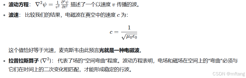 通过数学推导(取旋度、应用恒等式),在自由空间中导出波动方程(偏微分方程),预言了电磁波的存在和速度。