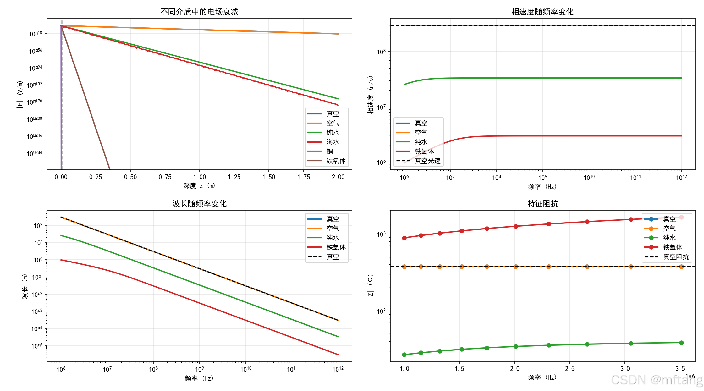 def wave_propagation_in_media():"""电磁波在介质中的传播"""class EMWaveInMedium:def __init__(self, frequency=1e9, E0=1.0, epsilon_r=1.0, mu_r=1.0, sigma=0):self.f = frequencyself.E0 = E0self.epsilon_r = epsilon_r # 相对介电常数self.mu_r = mu_r # 相对磁导率self.sigma = sigma # 电导率# 物理常数self.epsilon0 = constants.epsilon_0self.mu0 = constants.mu_0# 介质参数self.epsilon = epsilon_r * self.epsilon0self.mu = mu_r * self.mu0# 复介电常数(对于导电介质)self.epsilon_complex = self.epsilon - 1j * self.sigma / (2 * np.pi * self.f)# 波参数self.k_complex = 2 * np.pi * self.f * np.sqrt(self.mu * self.epsilon_complex)self.alpha = np.real(self.k_complex) # 衰减常数self.beta = np.imag(self.k_complex) # 相位常数self.wavelength = 2 * np.pi / self.alpha if self.alpha > 0 else float('inf')self.phase_velocity = 2 * np.pi * self.f / self.alpha if self.alpha > 0 else float('inf')# 特征阻抗self.Z_complex = np.sqrt(self.mu / self.epsilon_complex)print(f"介质中电磁波参数:")print(f"相对介电常数: ε_r = {epsilon_r}")print(f"相对磁导率: μ_r = {mu_r}")print(f"电导率: σ = {sigma} S/m")print(f"复波数: k = {self.k_complex:.3f}")print(f"衰减常数: α = {self.alpha:.3f} Np/m")print(f"相位常数: β = {self.beta:.3f} rad/m")print(f"波长: λ = {self.wavelength:.3f} m")print(f"相速度: v_p = {self.phase_velocity/1e6:.1f} × 10⁶ m/s")print(f"特征阻抗: Z = {self.Z_complex:.3f} Ω")def field_in_medium(self, z, t):"""介质中的电磁场"""# 电场E = self.E0 * np.exp(-self.alpha * z) * np.cos(self.beta * z - 2 * np.pi * self.f * t)# 磁场H = (self.E0 / np.abs(self.Z_complex)) * np.exp(-self.alpha * z) * np.cos(self.beta * z - 2 * np.pi * self.f * t - np.angle(self.Z_complex))return E, Hdef skin_depth(self):"""趋肤深度(对于良导体)"""if self.sigma > 0:delta = 1 / np.sqrt(np.pi * self.f * self.mu * self.sigma)return deltaelse:return float('inf')# 不同介质的比较media_cases = [{'name': '真空', 'epsilon_r': 1.0, 'mu_r': 1.0, 'sigma': 0},{'name': '空气', 'epsilon_r': 1.0006, 'mu_r': 1.0, 'sigma': 0},{'name': '纯水', 'epsilon_r': 80.0, 'mu_r': 1.0, 'sigma': 0.01},{'name': '海水', 'epsilon_r': 80.0, 'mu_r': 1.0, 'sigma': 4.0},{'name': '铜', 'epsilon_r': 1.0, 'mu_r': 1.0, 'sigma': 5.8e7},{'name': '铁氧体', 'epsilon_r': 10.0, 'mu_r': 1000.0, 'sigma': 0.01}]# 空间网格z = np.linspace(0, 2, 500) # 2米范围fig, axes = plt.subplots(2, 2, figsize=(12, 8))for i, medium in enumerate(media_cases):wave = EMWaveInMedium(frequency=1e9, E0=1.0, epsilon_r=medium['epsilon_r'], mu_r=medium['mu_r'], sigma=medium['sigma'])# 计算电场E, H = wave.field_in_medium(z, t=0)# 电场衰减axes[0, 0].semilogy(z, np.abs(E), linewidth=2, label=medium['name'])# 趋肤深度标记if medium['sigma'] > 1:delta = wave.skin_depth()axes[0, 0].axvline(x=delta, color='gray', linestyle='--', alpha=0.5)print(f"{medium['name']} 趋肤深度: {delta*100:.2f} cm")axes[0, 0].set_xlabel('深度 z (m)')axes[0, 0].set_ylabel('|E| (V/m)')axes[0, 0].set_title('不同介质中的电场衰减')axes[0, 0].legend()axes[0, 0].grid(True, alpha=0.3)# 相速度比较frequencies = np.logspace(6, 12, 100) # 1 MHz 到 1 THzfor medium in [m for m in media_cases if m['sigma'] < 1]: # 低损耗介质v_phase = []for f in frequencies:wave = EMWaveInMedium(frequency=f, E0=1.0,epsilon_r=medium['epsilon_r'],mu_r=medium['mu_r'],sigma=medium['sigma'])v_phase.append(wave.phase_velocity)axes[0, 1].loglog(frequencies, v_phase, linewidth=2, label=medium['name'])axes[0, 1].axhline(y=constants.c, color='k', linestyle='--', label='真空光速')axes[0, 1].set_xlabel('频率 (Hz)')axes[0, 1].set_ylabel('相速度 (m/s)')axes[0, 1].set_title('相速度随频率变化')axes[0, 1].legend()axes[0, 1].grid(True, alpha=0.3)# 波长比较for medium in [m for m in media_cases if m['sigma'] < 1]: # 低损耗介质wavelengths = []for f in frequencies:wave = EMWaveInMedium(frequency=f, E0=1.0,epsilon_r=medium['epsilon_r'],mu_r=medium['mu_r'],sigma=medium['sigma'])wavelengths.append(wave.wavelength)axes[1, 0].loglog(frequencies, wavelengths, linewidth=2, label=medium['name'])wavelengths_vacuum = constants.c / frequenciesaxes[1, 0].loglog(frequencies, wavelengths_vacuum, 'k--', label='真空')axes[1, 0].set_xlabel('频率 (Hz)')axes[1, 0].set_ylabel('波长 (m)')axes[1, 0].set_title('波长随频率变化')axes[1, 0].legend()axes[1, 0].grid(True, alpha=0.3)# 特征阻抗比较for medium in media_cases:if medium['sigma'] < 1: # 低损耗介质Z_values = []for f in frequencies[:10]: # 只计算部分频率点wave = EMWaveInMedium(frequency=f, E0=1.0,epsilon_r=medium['epsilon_r'],mu_r=medium['mu_r'],sigma=medium['sigma'])Z_values.append(np.abs(wave.Z_complex))axes[1, 1].semilogy(frequencies[:10], Z_values, 'o-', linewidth=2, label=medium['name'])Z_vacuum = np.sqrt(constants.mu_0 / constants.epsilon_0)axes[1, 1].axhline(y=Z_vacuum, color='k', linestyle='--', label='真空阻抗')axes[1, 1].set_xlabel('频率 (Hz)')axes[1, 1].set_ylabel('|Z| (Ω)')axes[1, 1].set_title('特征阻抗')axes[1, 1].legend()axes[1, 1].grid(True, alpha=0.3)plt.tight_layout()plt.show()return media_cases# 运行介质中传播分析