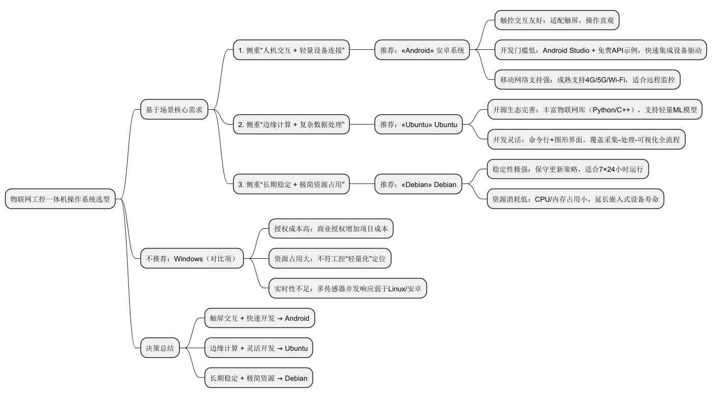 针对物联网工控一体机的操作系统选型需求,结合场景特性给出精准推荐:若侧重触屏交互与快速开发,优先选安卓,其触控友好、开发门槛低且移动网络适配性强;若侧重边缘计算与灵活开发,优选 Ubuntu,凭借完善的开源生态和工具链,可高效搭建数据采集、处理与分析流程;若侧重长期稳定与极简资源占用,推荐 Debian,以极强的系统稳定性和超低资源消耗,适配无人值守、长周期运行的物联网场景。同时对比说明 Windows 因授权成本高、资源占用大、实时性不足,在工控物联网场景中并非优先选择,助力物联网项目根据交互、数据处理、稳定性等核心需求高效选型。