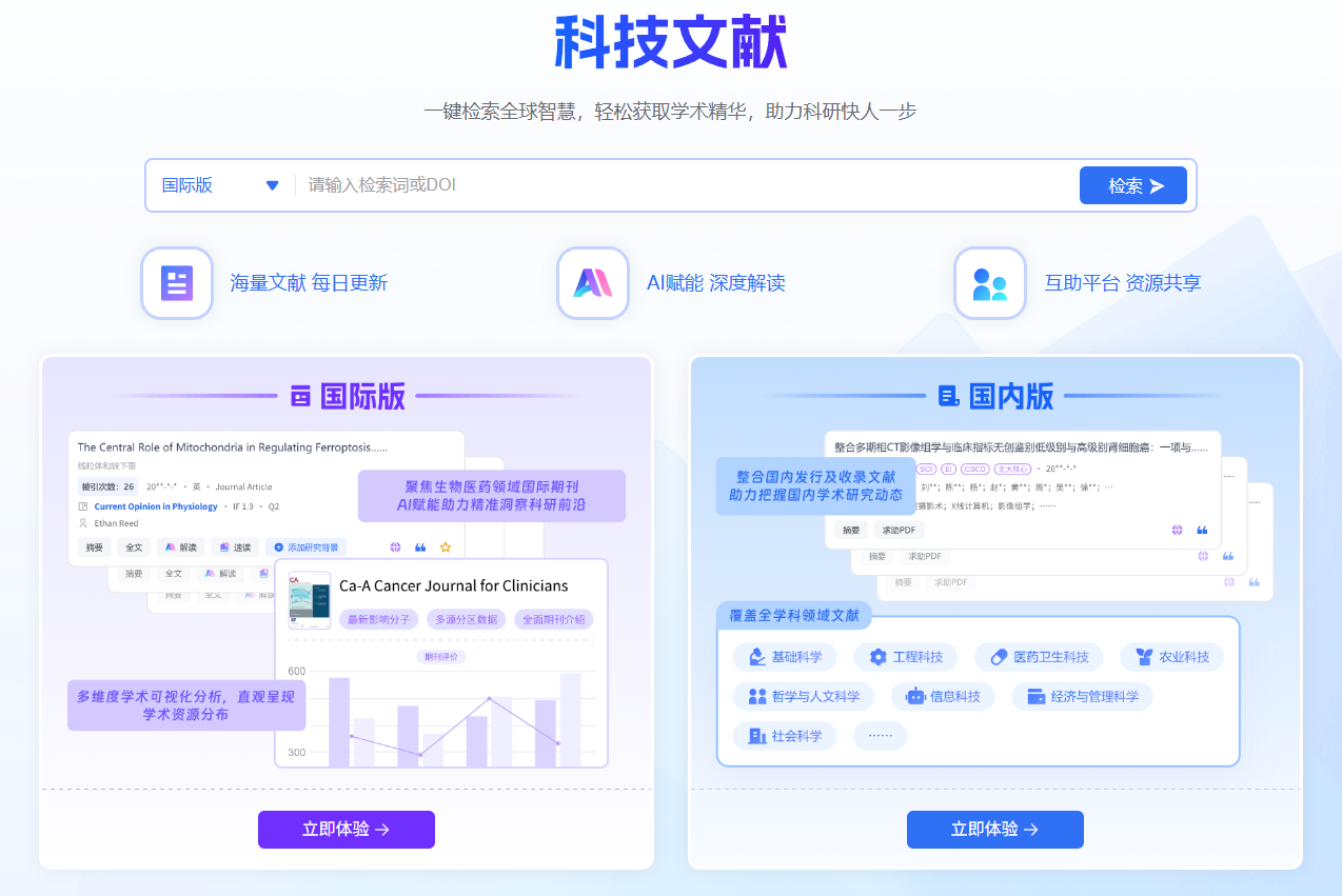 MedPeer的“科技文献”模块正是为了弥补这些不足而生,它构建了“国际版+国内版”双平台架构,让你无需切换多个网站,即可一站式获取全球权威文献。