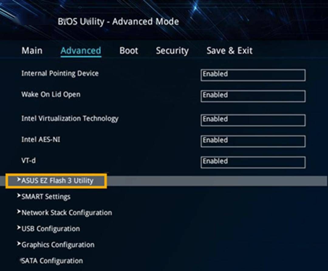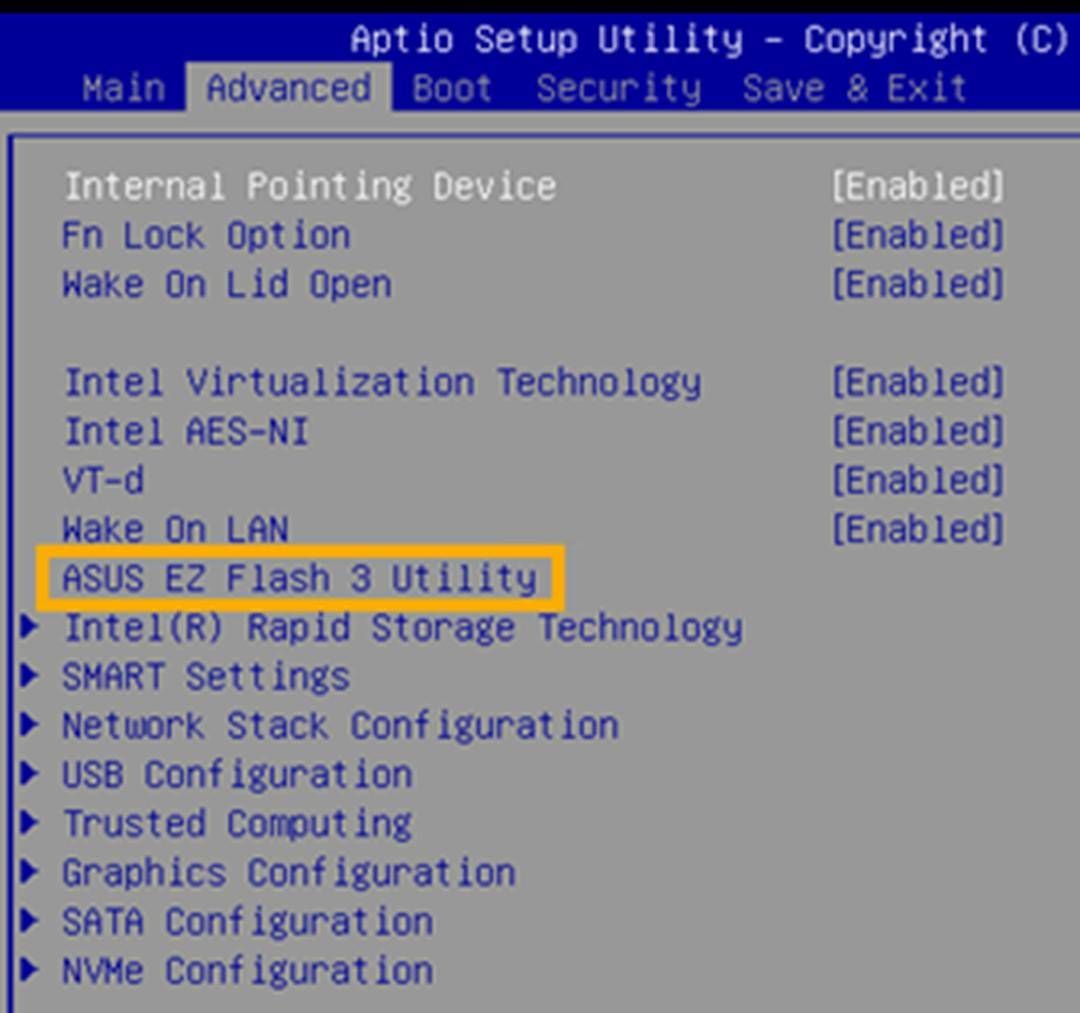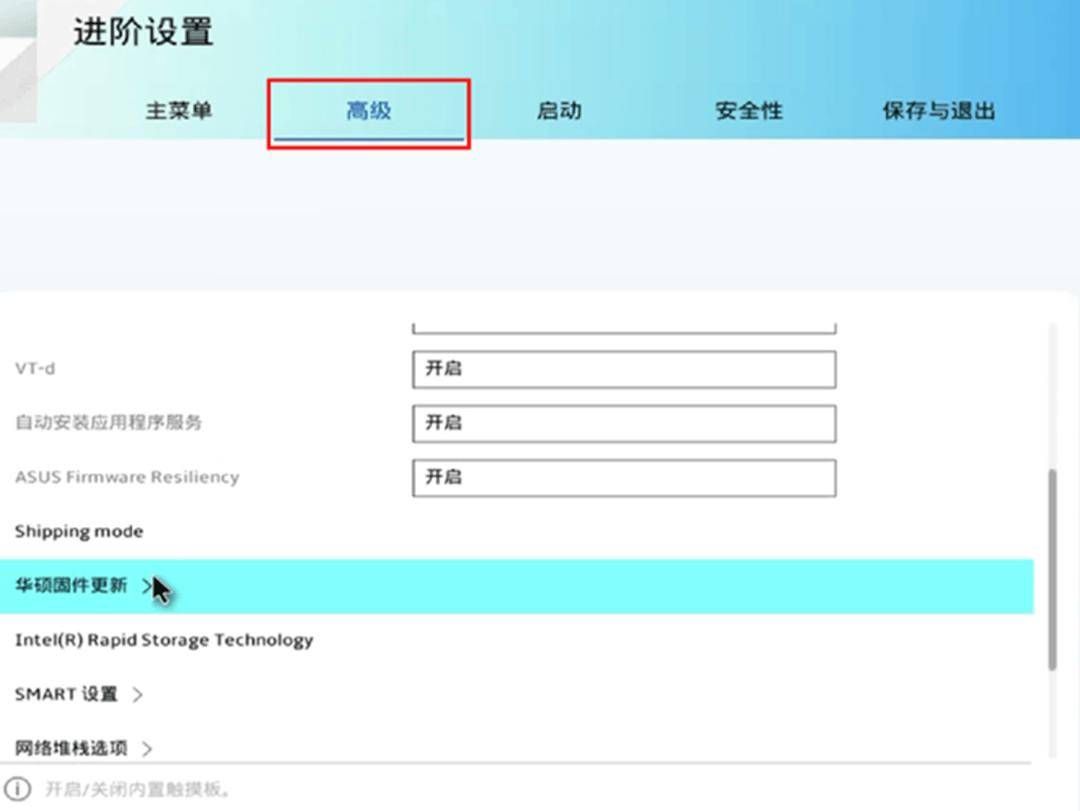 - 按F7进入「Advanced Mode」(高级模式),选择「ASUS EZ Flash Utility」或「华硕固件更新」。