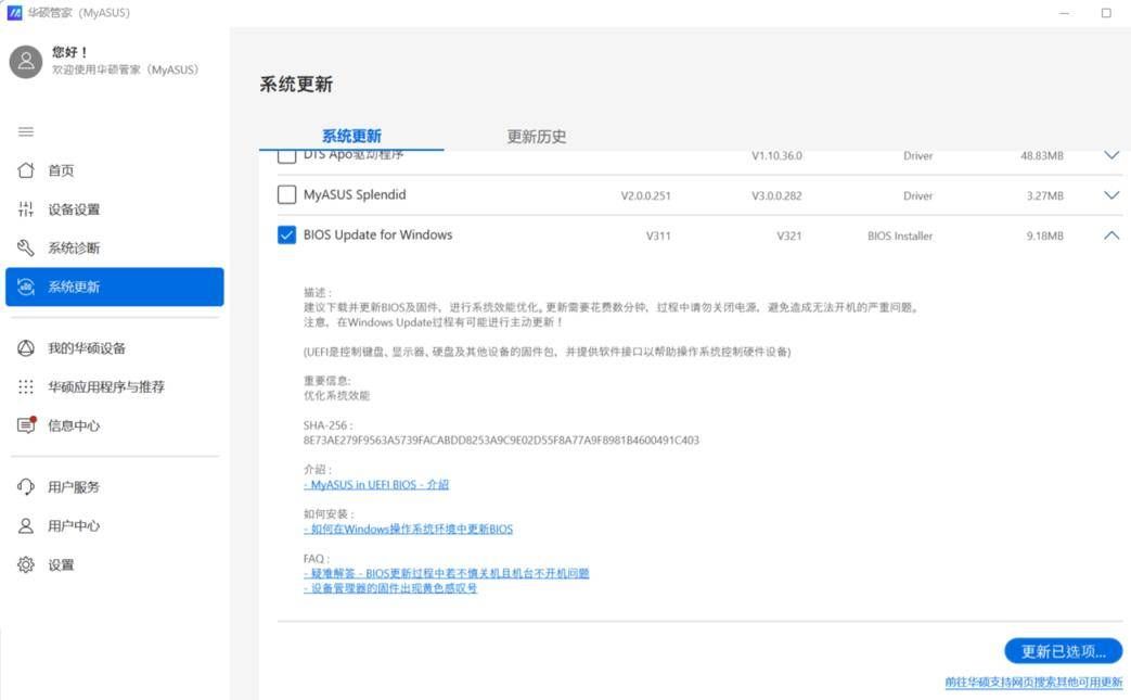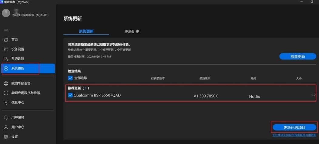 - 部分更新会通过「华硕管家 MyASUS」推送,打开 MyASUS → 「系统更新」→ 勾选「BIOS Update for Windows」或「BSP 组件」进行更新。