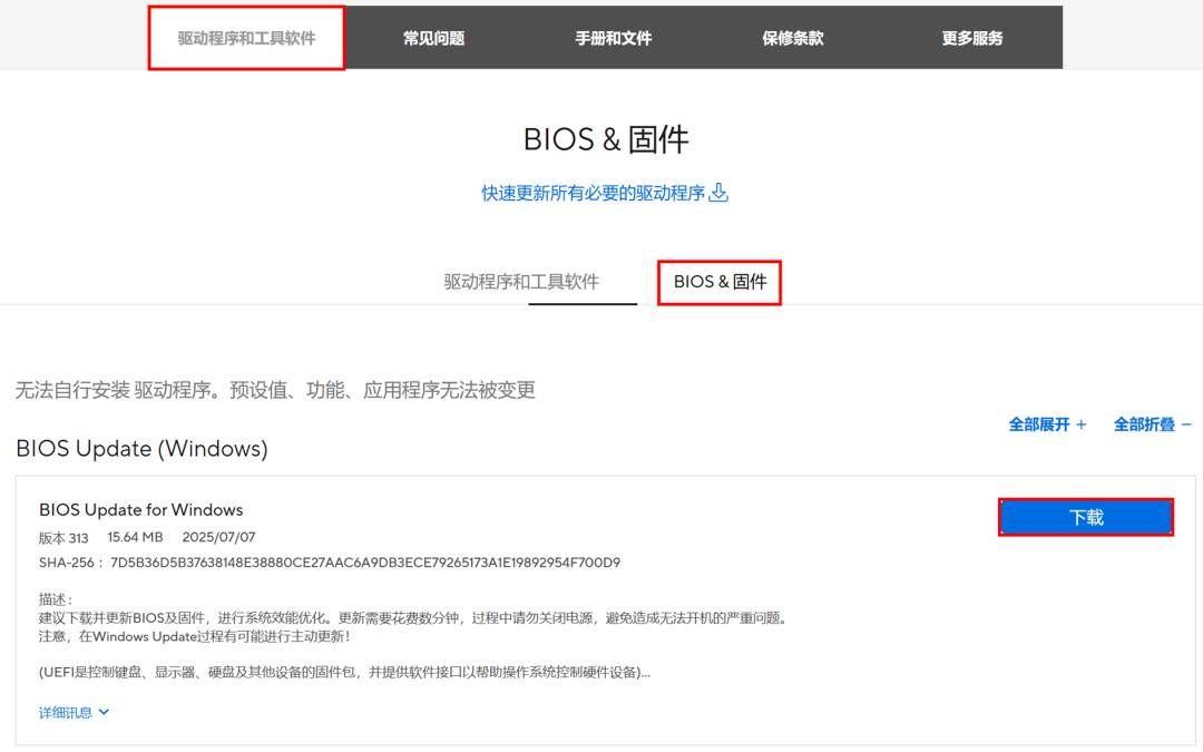 - 访问华硕官网支持页面,输入机型名称,在「驱动程序和工具软件」中找到「BIOS & 固件」,下载对应文件:
