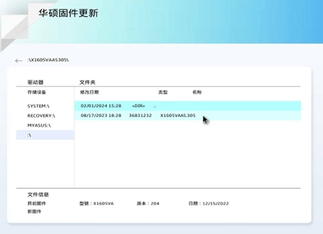 - 选择提前准备好的BIOS文件(可以存放在本地磁盘或FAT32格式的U盘中),并按提示操作。