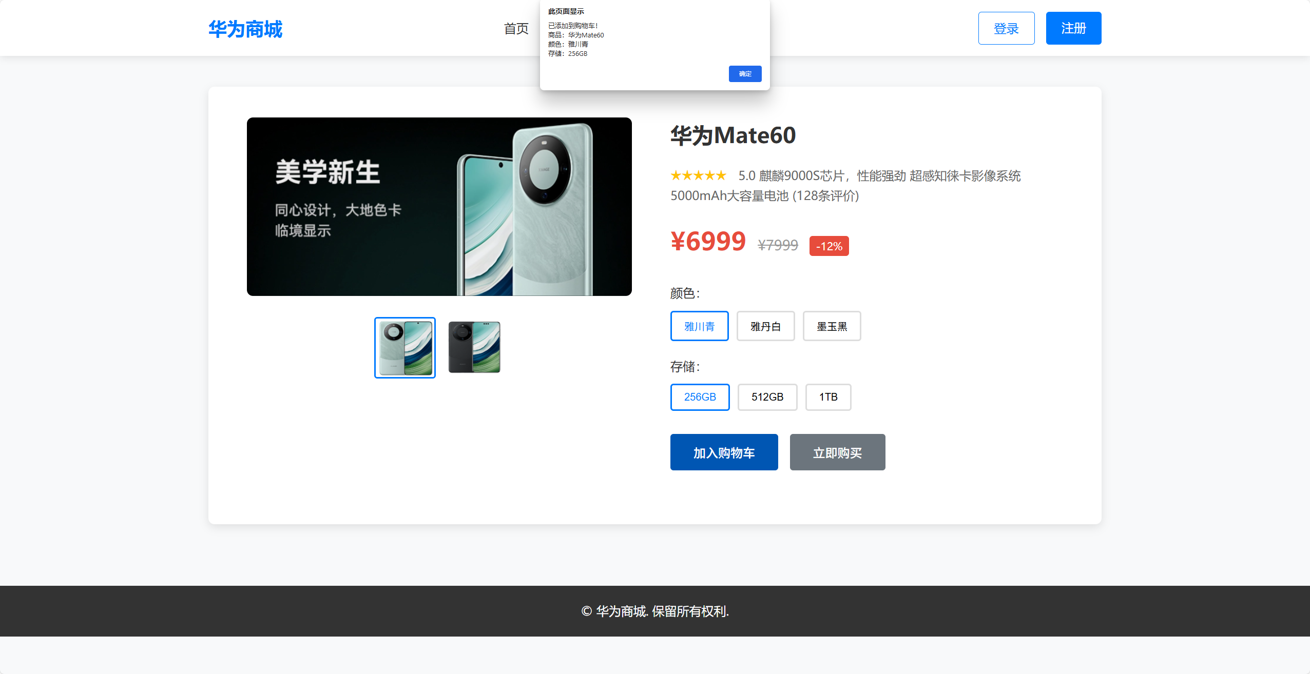 <body><!-- 头部导航 --><header class="header"><div class="container"><div class="logo"><h1><a href="index.html">华为商城</a></h1></div><nav class="nav"><ul class="nav-list"><li class="nav-item"><a href="index.html" class="nav-link">首页</a></li><li class="nav-item dropdown"><a href="#" class="nav-link">手机</a><ul class="dropdown-menu"><li><a href="product.html">Mate系列</a></li><li><a href="product.html">P系列</a></li><li><a href="product.html">nova系列</a></li></ul></li><li class="nav-item dropdown"><a href="#" class="nav-link">笔记本</a><ul class="dropdown-menu"><li><a href="product.html">MateBook</a></li><li><a href="product.html">MagicBook</a></li></ul></li><li class="nav-item"><a href="#" class="nav-link">平板</a></li><li class="nav-item"><a href="#" class="nav-link">智能穿戴</a></li></ul></nav><div class="user-actions"><a href="login.html" class="btn btn-login">登录</a><a href="register.html" class="btn btn-register">注册</a></div></div></header><!-- 商品详情 --><section class="product-detail"><div class="container"><div class="product-content"><div class="product-images"><div class="main-image"><img src="images/8.png" alt="华为Mate60" id="mainImage"></div><div class="thumbnail-images"><img src="images/9.png" alt="图片1" class="thumbnail active" onclick="changeImage(this)"><img src="images/10.png" alt="图片2" class="thumbnail" onclick="changeImage(this)"></div></div><div class="product-info"><h1>华为Mate60</h1><div class="product-rating"><span class="stars">★★★★★</span><span class="rating-text">5.0 麒麟9000S芯片,性能强劲 超感知徕卡影像系统 5000mAh大容量电池 (128条评价)</span></div><div class="product-price"><span class="current-price">¥6999</span><span class="original-price">¥7999</span><span class="discount">-12%</span></div><div class="product-options"><div class="option-group"><label>颜色:</label><div class="color-options"><button class="color-btn active" data-color="雅川青">雅川青</button><button class="color-btn" data-color="雅丹白">雅丹白</button><button class="color-btn" data-color="墨玉黑">墨玉黑</button></div></div><div class="option-group"><label>存储:</label><div class="storage-options"><button class="storage-btn active" data-storage="256GB">256GB</button><button class="storage-btn" data-storage="512GB">512GB</button><button class="storage-btn" data-storage="1TB">1TB</button></div></div></div><div class="product-actions"><button class="btn btn-primary btn-large" onclick="addToCart()">加入购物车</button><button class="btn btn-secondary btn-large" onclick="buyNow()">立即购买</button></div></div></div></div></section><!-- 页脚 --><footer class="footer"><div class="container"><p>© 华为商城. 保留所有权利.</p></div></footer><script src="js/script.js"></script>