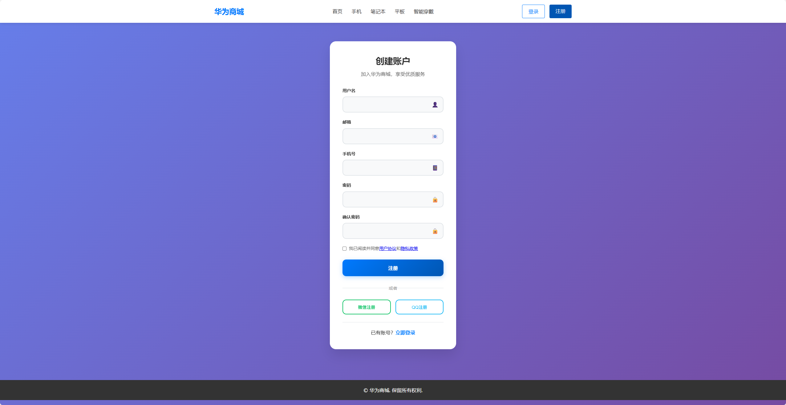 - **完整注册表单**:包含用户名、邮箱、手机号、密码设置和确认等字段