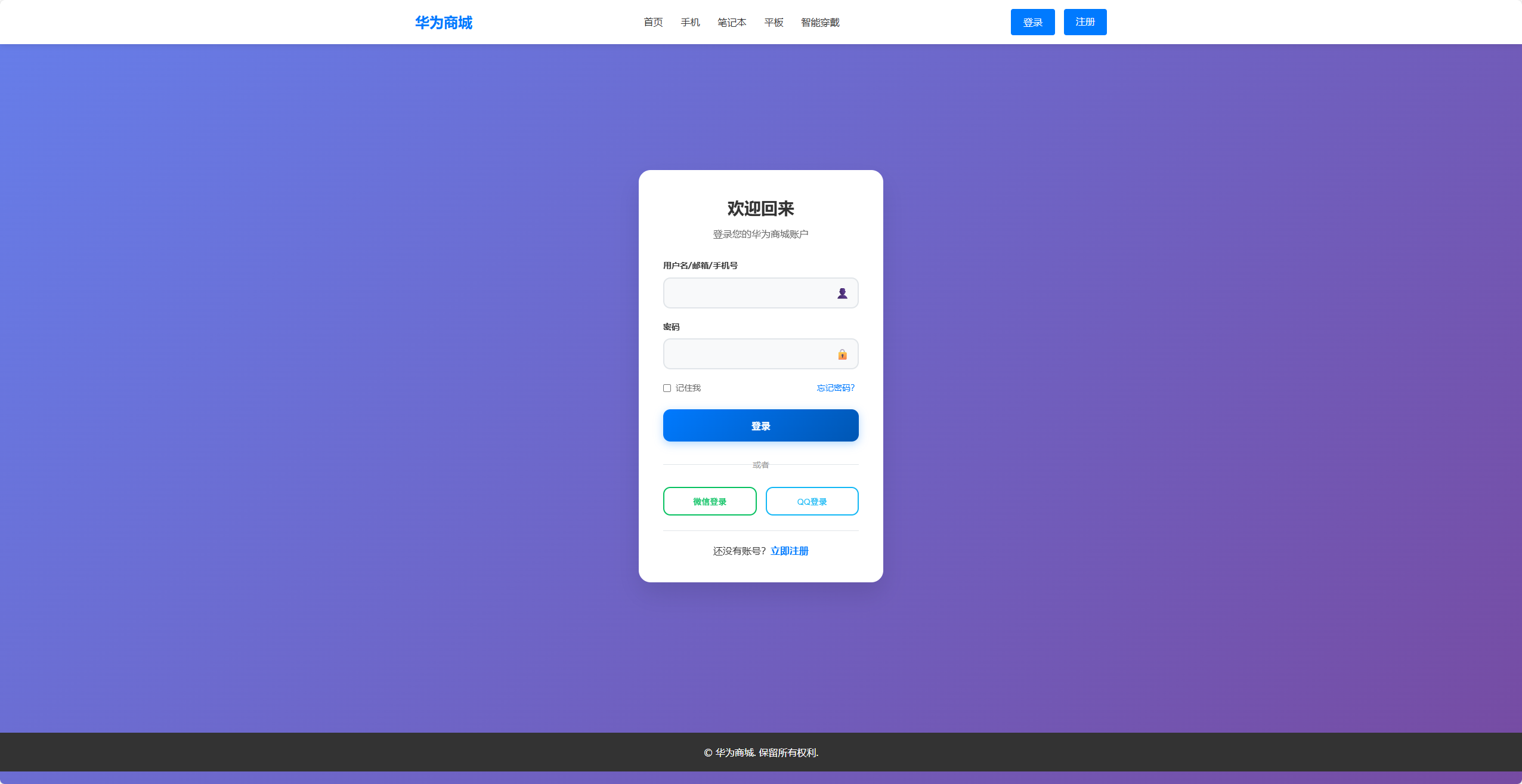 <head><meta charset="UTF-8"><meta name="viewport" content="width=device-width, initial-scale=1.0"><title>用户登录 - 华为商城</title><link rel="stylesheet" href="css/style.css">
