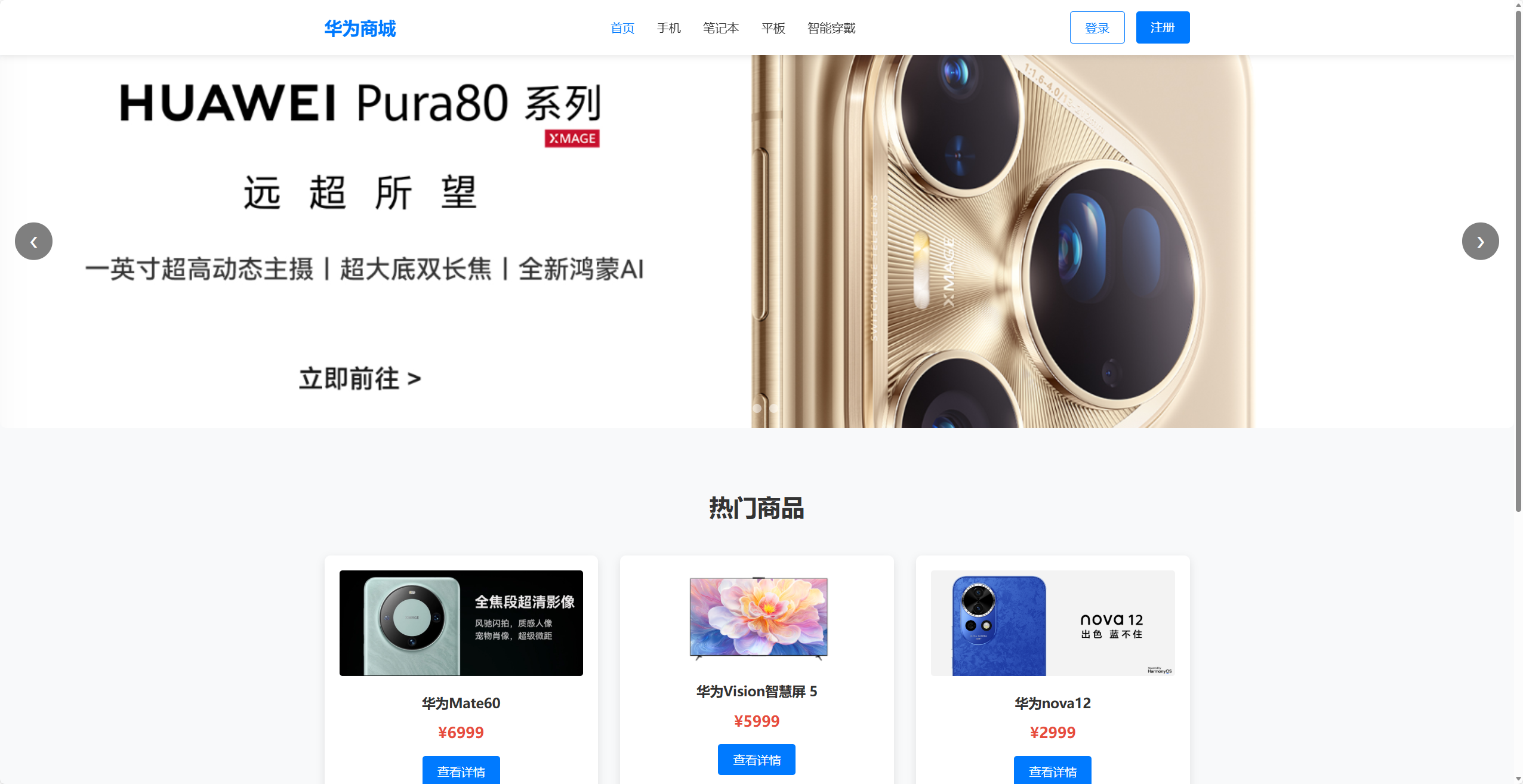- **轮播图**:展示华为最新产品,支持自动轮播、手动切换和指示器导航