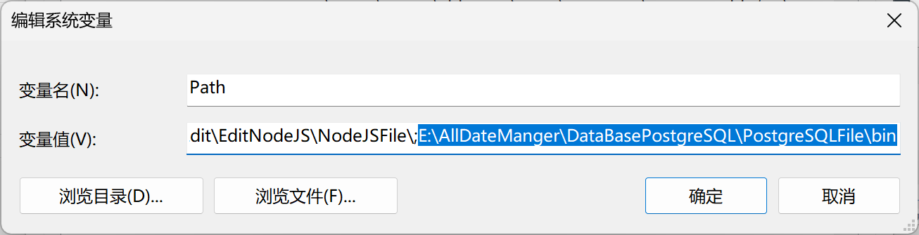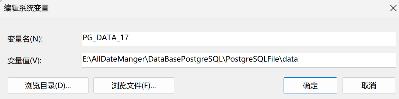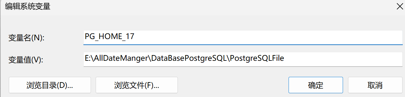 高级系统设置,然后点击高级系统设置,再点击环境变量,在系统变量中找到Path变量,然后点击新建,将复制好的bin路径复制进去,最后点击三个确定。设置PG_HOME_17变量及PG_DATA_17变量,如图设置