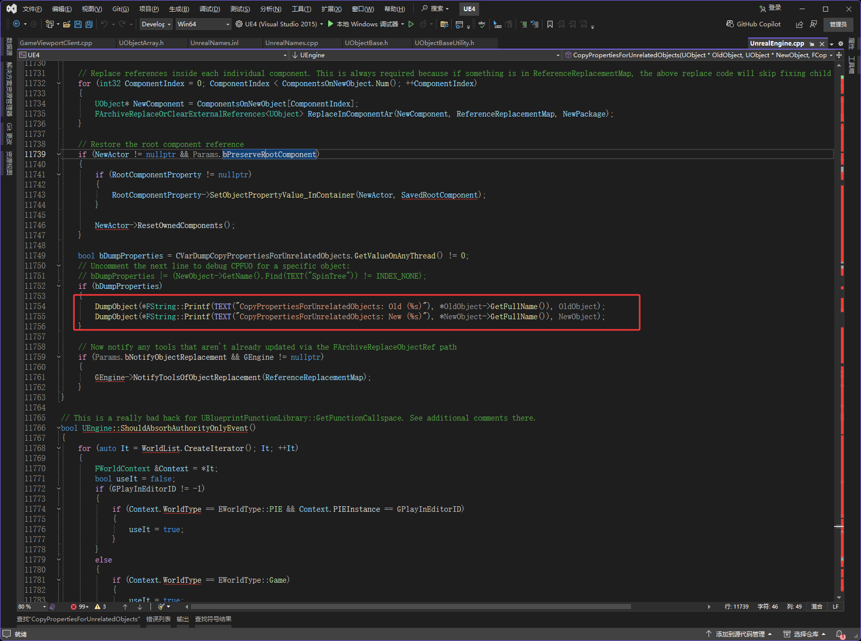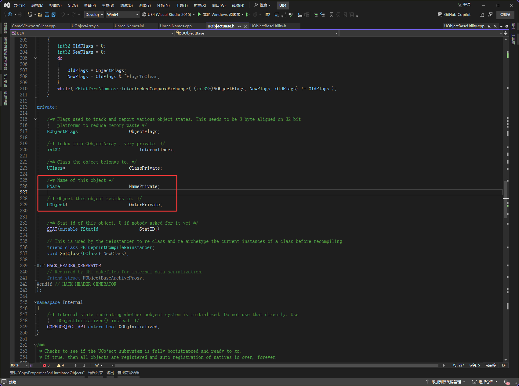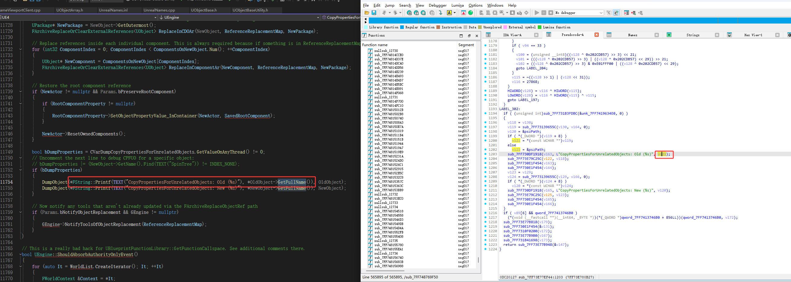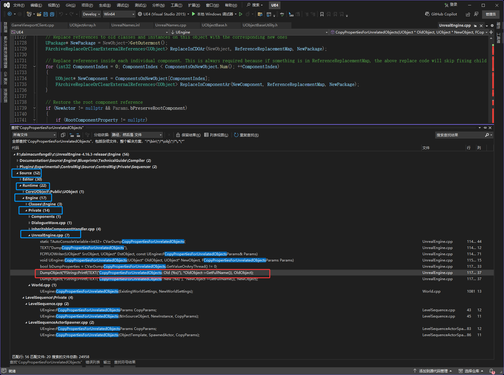 上一个内容中重新梳理了,UObject,然后找到了UObjectBase,然后通过内存分析UObjectBase里的成员全部都进行了加密,找解密的方式,可以从GetFullName函数中找,GetFullName函数中访问了Class、FName、UObject(OuterPrivate),想定位GetFullName就要找定位它的字符串,定位的字符串是CopyPropertiesForUnrelatedObjects,如下图在UE源码中搜索CopyPropertiesForUnrelatedObjects