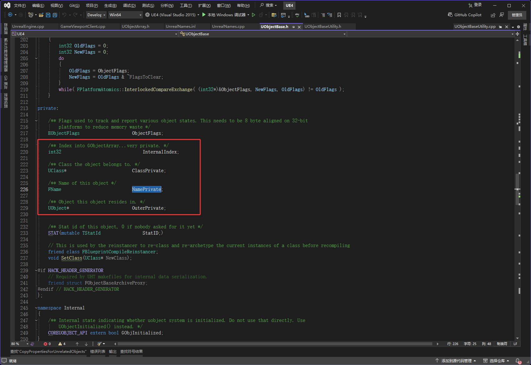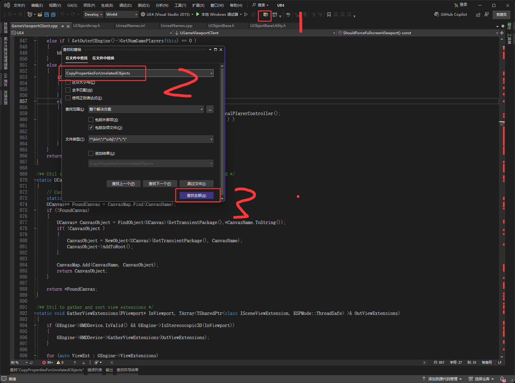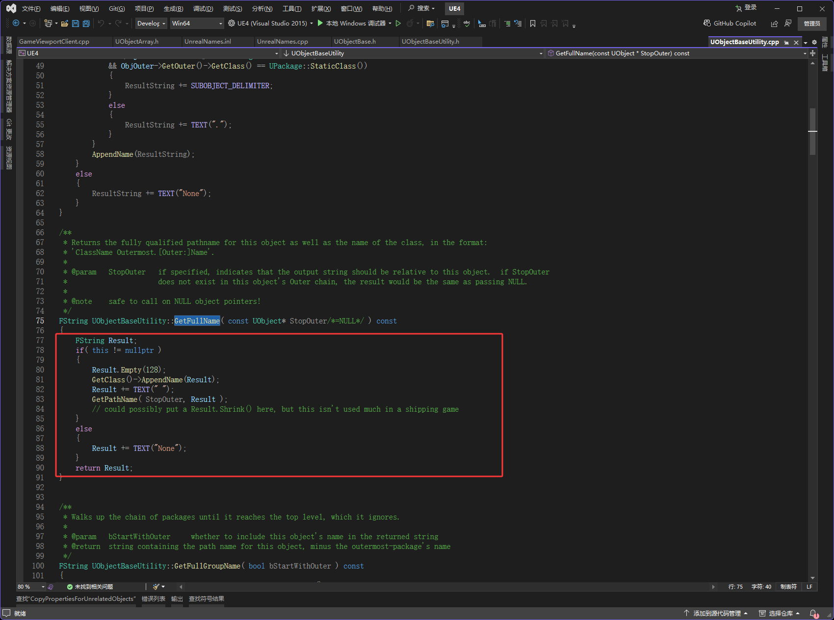 上一个内容中重新梳理了,UObject,然后找到了UObjectBase,然后通过内存分析UObjectBase里的成员全部都进行了加密,找解密的方式,可以从GetFullName函数中找,GetFullName函数中访问了Class、FName、UObject(OuterPrivate),想定位GetFullName就要找定位它的字符串,定位的字符串是CopyPropertiesForUnrelatedObjects,如下图在UE源码中搜索CopyPropertiesForUnrelatedObjects