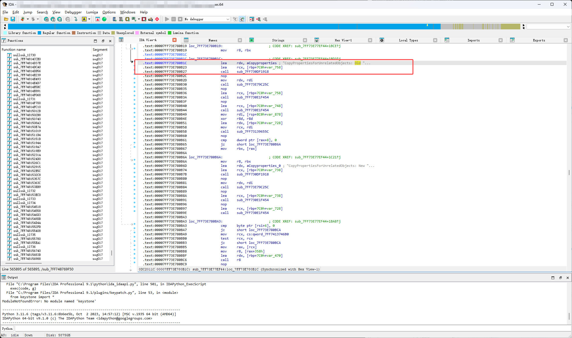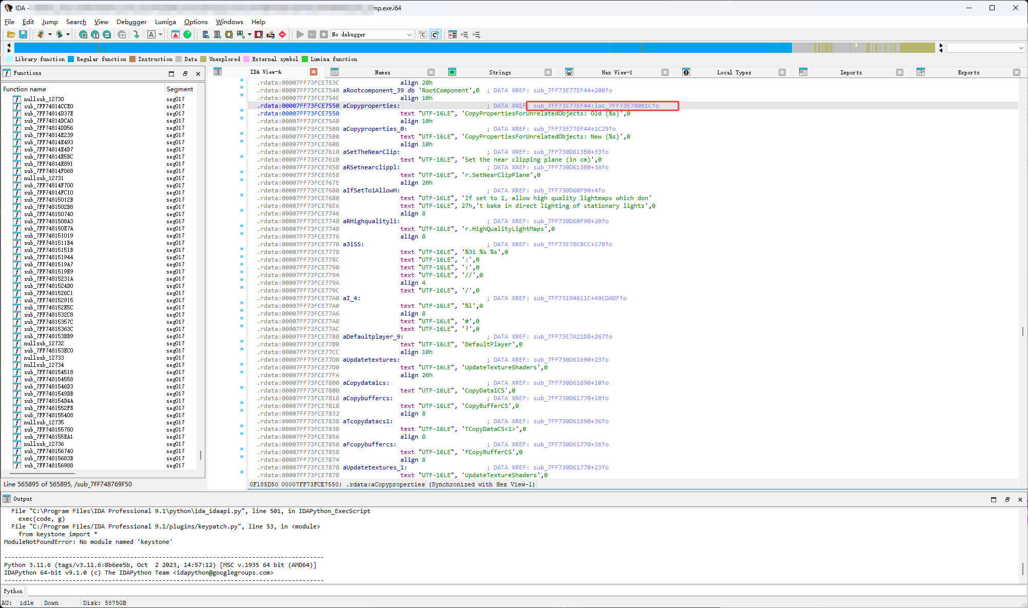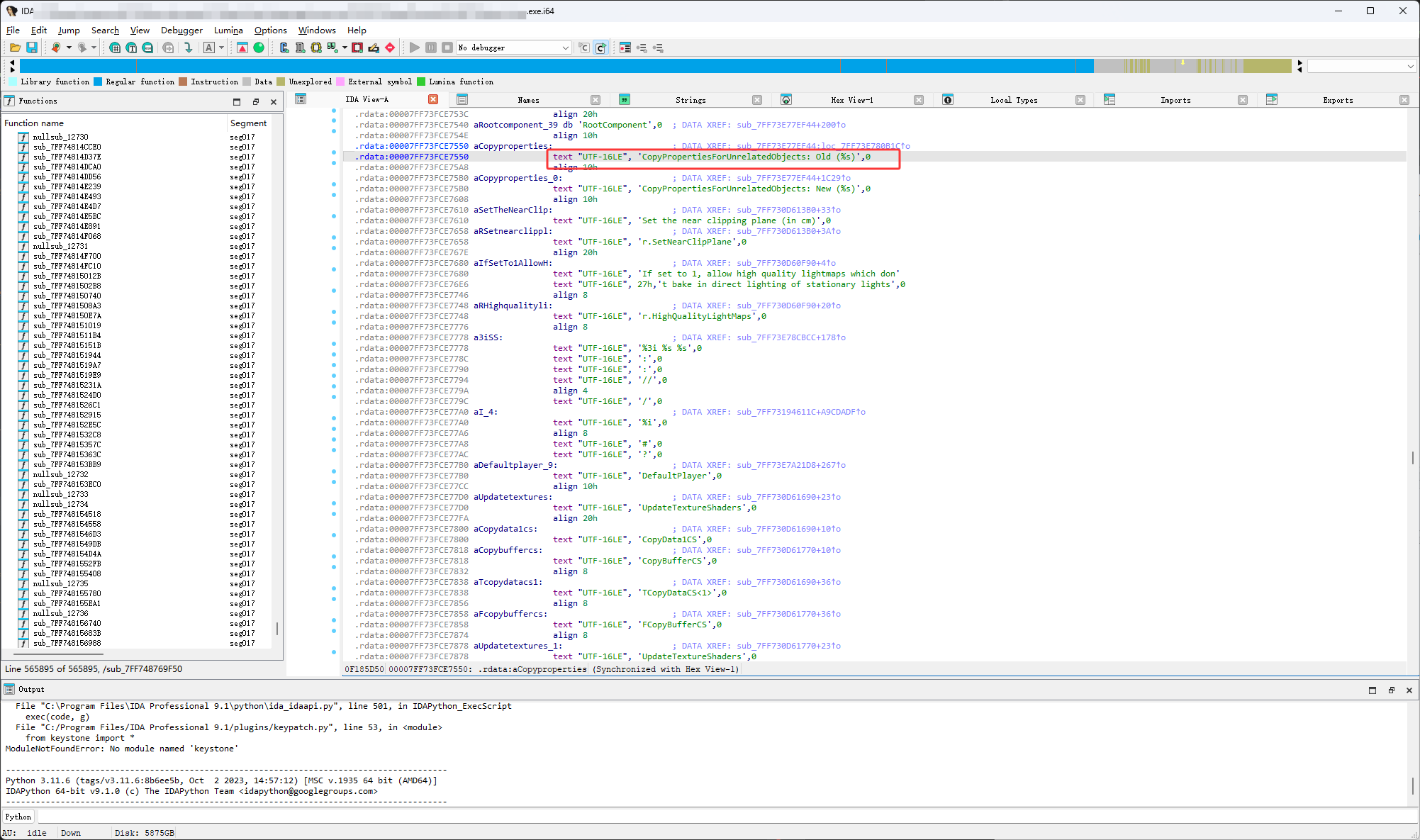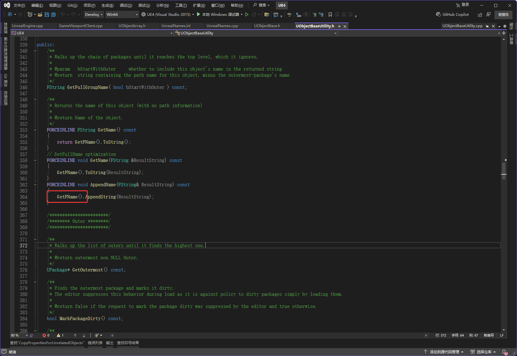 上一个内容中重新梳理了,UObject,然后找到了UObjectBase,然后通过内存分析UObjectBase里的成员全部都进行了加密,找解密的方式,可以从GetFullName函数中找,GetFullName函数中访问了Class、FName、UObject(OuterPrivate),想定位GetFullName就要找定位它的字符串,定位的字符串是CopyPropertiesForUnrelatedObjects,如下图在UE源码中搜索CopyPropertiesForUnrelatedObjects