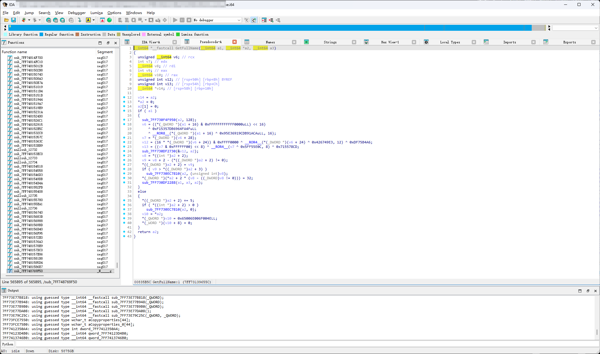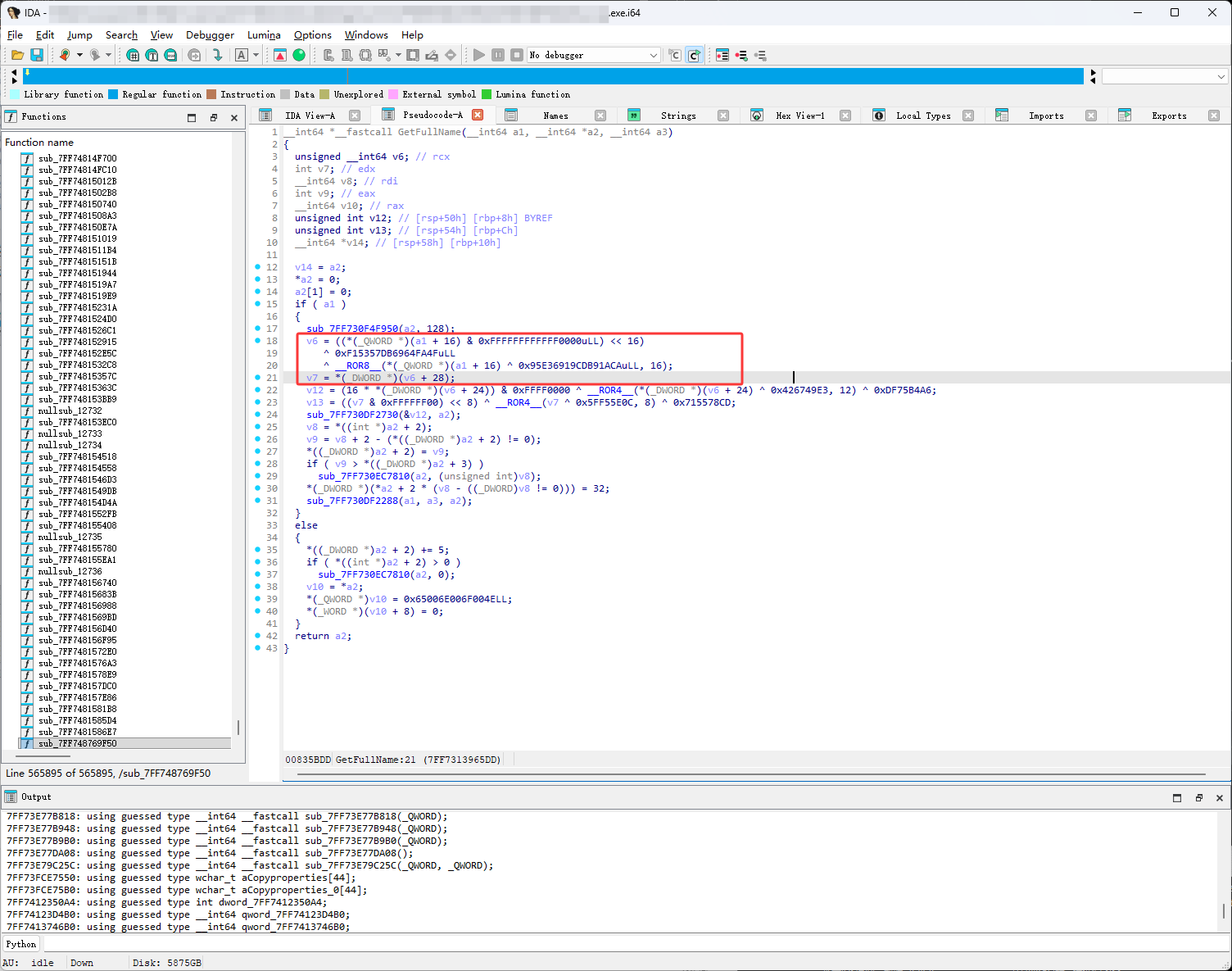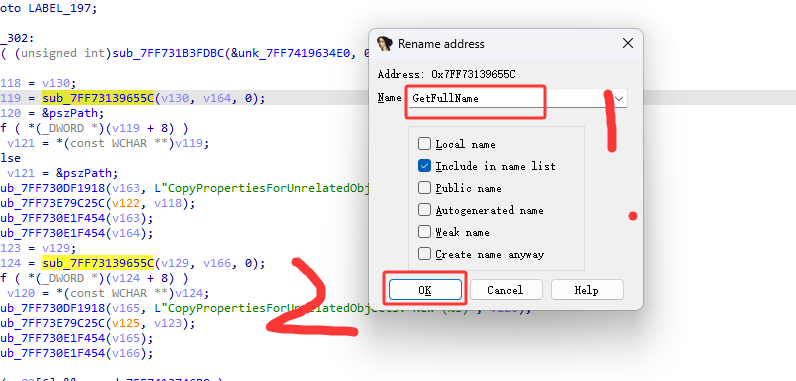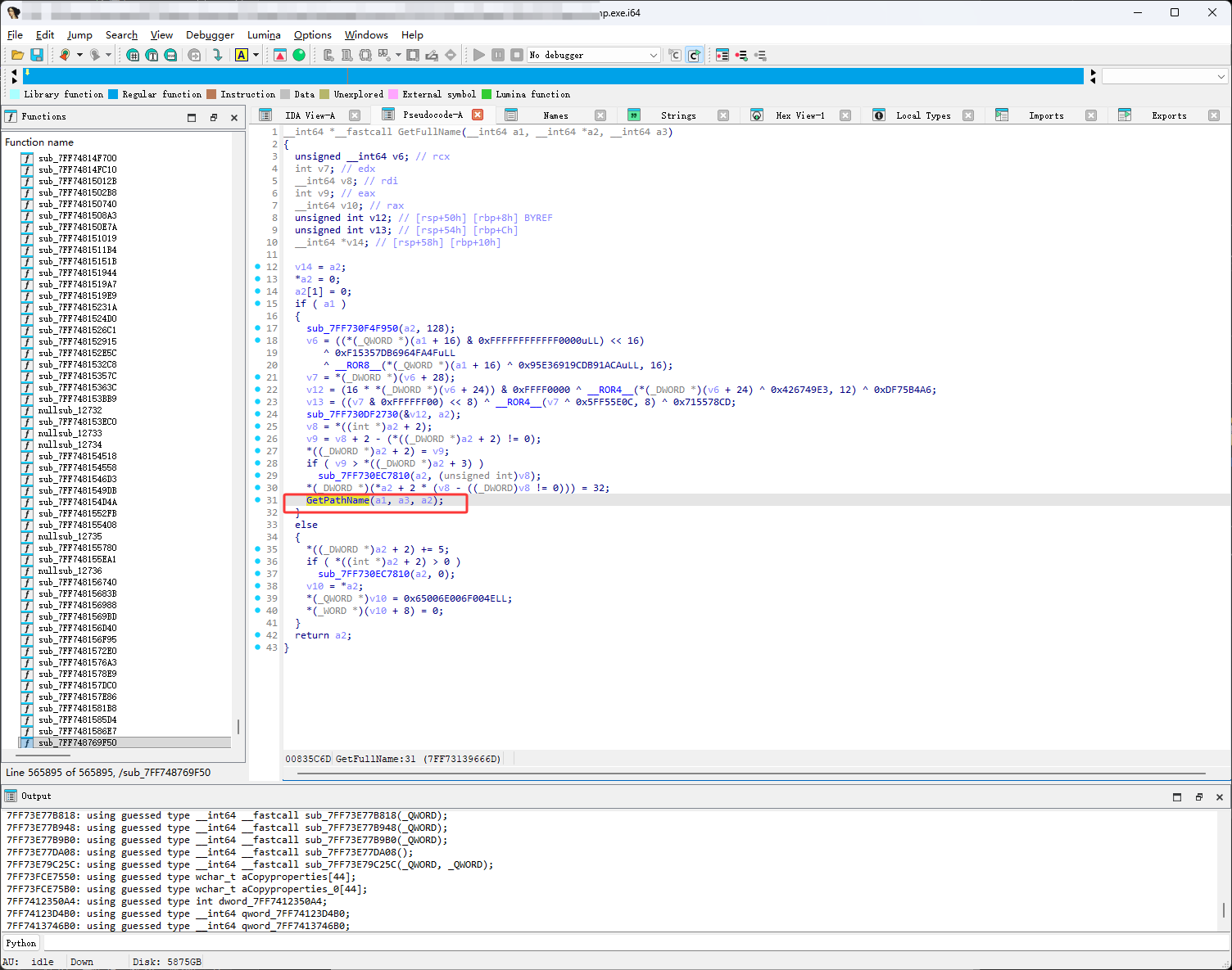 如下图红框v121的值来自于v119,然后v119的值来自于sub_7FF73139655C(v130, v164, 0);,所以sub_7FF73139655C是GetFullName