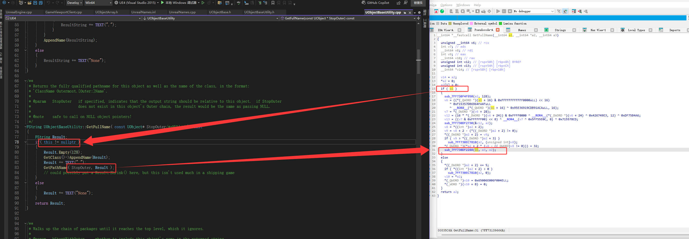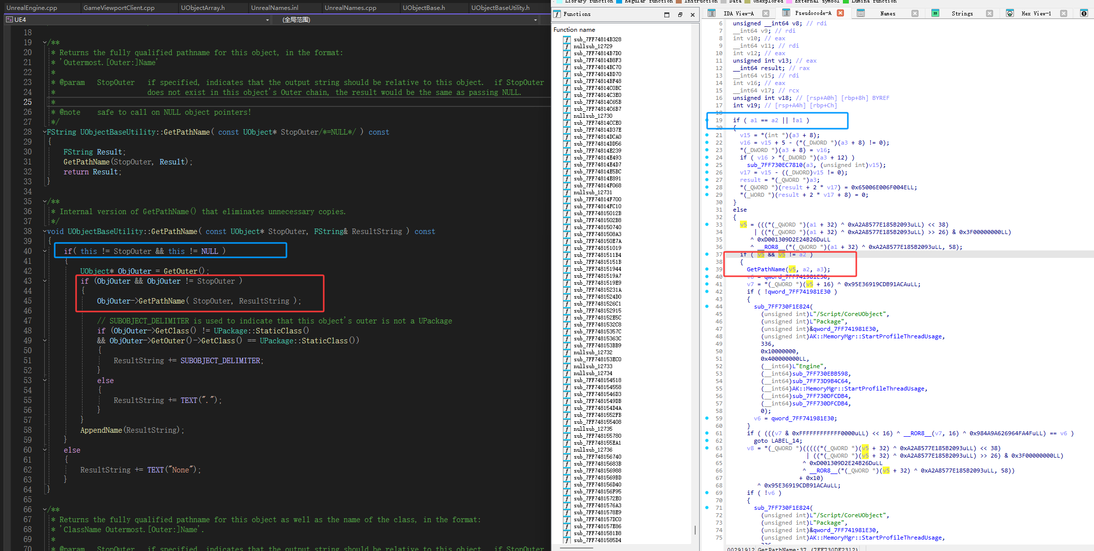 接下来在ida中找GetPathName,如下图红框GetPathName( StopOuter, Result );两个参数,但是它是在UObjectBaseUtility类中调用的,所以它本质上是UObjectBaseUtility.GetPathName( StopOuter, Result );,也就是this.GetPathName( StopOuter, Result );编译完的代码GetPathName( this,StopOuter, Result )这样的,下图红框的sub_7FF730DF2288比较符合a1在if里,UE源码中使用if里是this,所以ai就是this