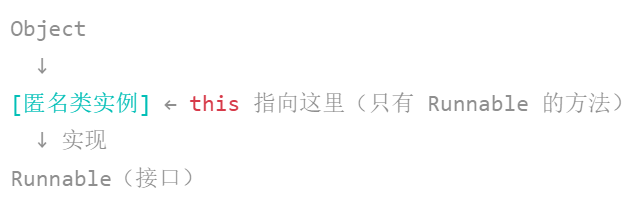 class AnonymousRunnable implements Runnable { // 实现 Runnable@Overridepublic void run() {// this 指向 AnonymousRunnable 实例,它只是 Runnable,不是 Thread// this.getName() 不存在!System.out.println(Thread.currentThread().getName());}