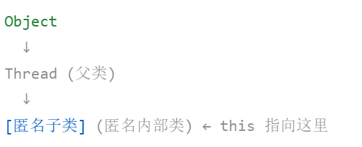 class AnonymousThread extends Thread { // 编译器生成的匿名类@Overridepublic void run() {System.out.println(this.getName()); // this 指向 AnonymousThread 实例System.out.println(Thread.currentThread().getName());}