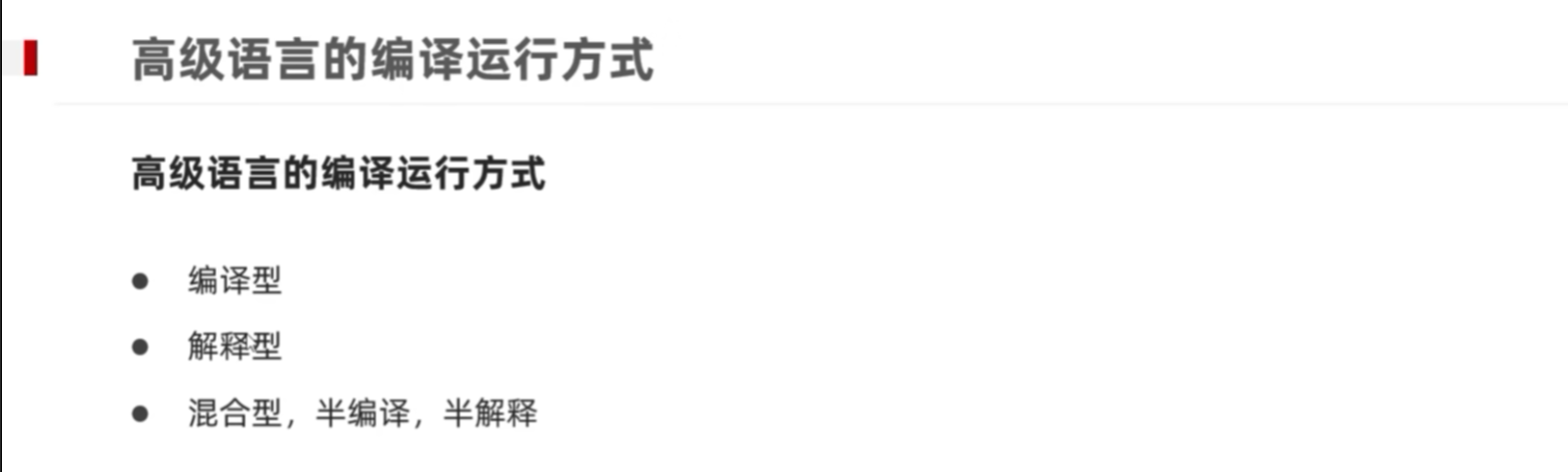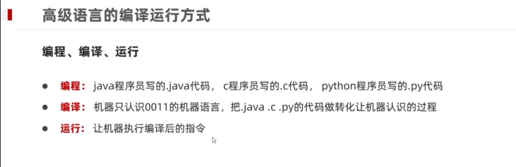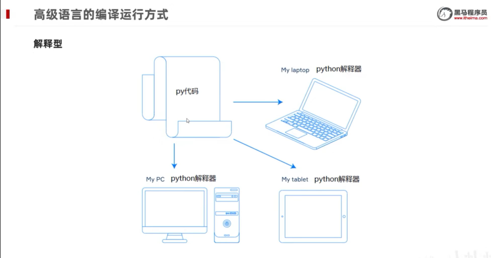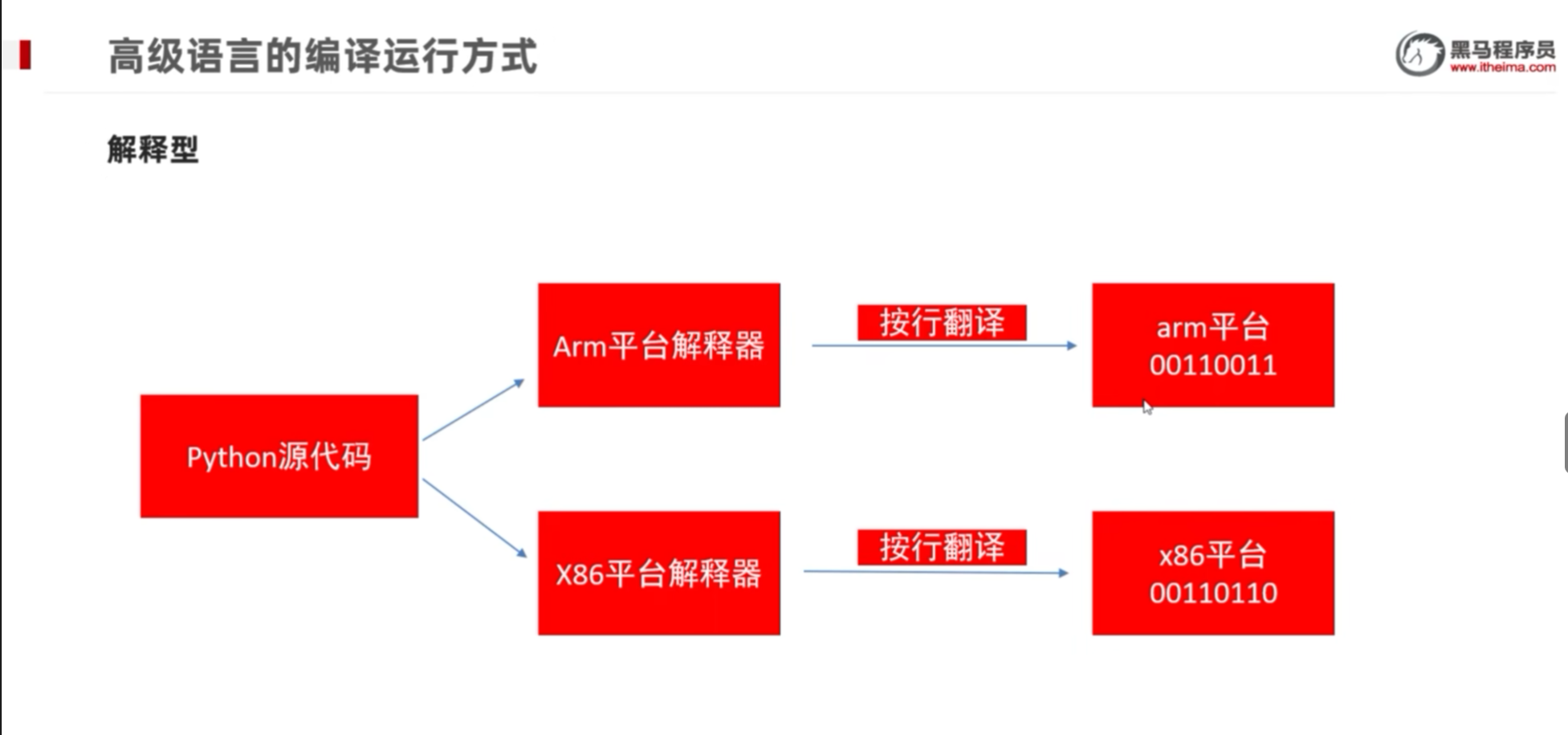 解释型语言:就是读一行编译一行然后去运行,读一行编译一行然后去运行。编写代码、按行编译、再交给不同设备去运行。细节:python是不会产生新的文件的,所以说python程序员天生开源,因为就是拿着源文件读一行编译一行运行一行的。