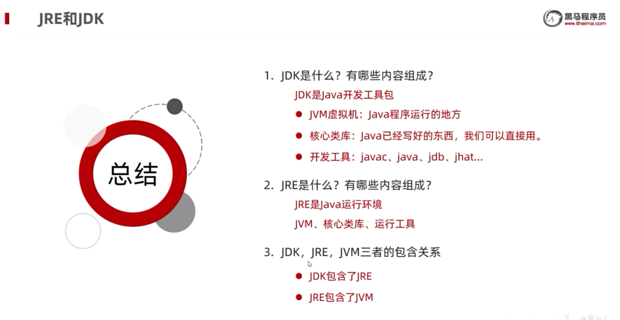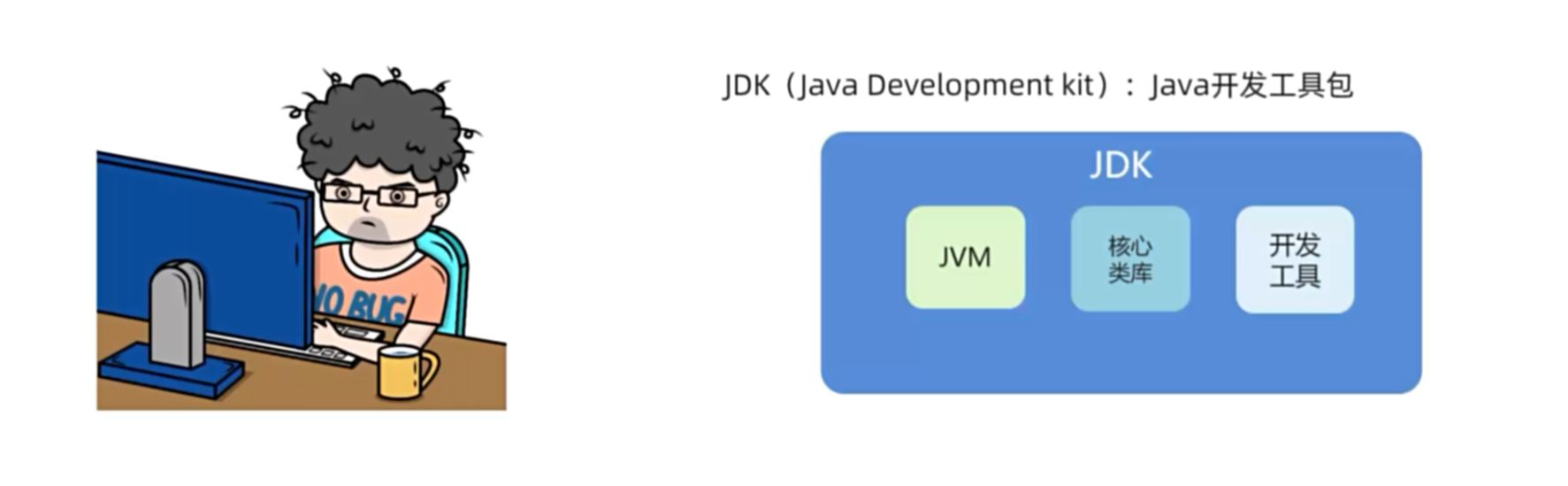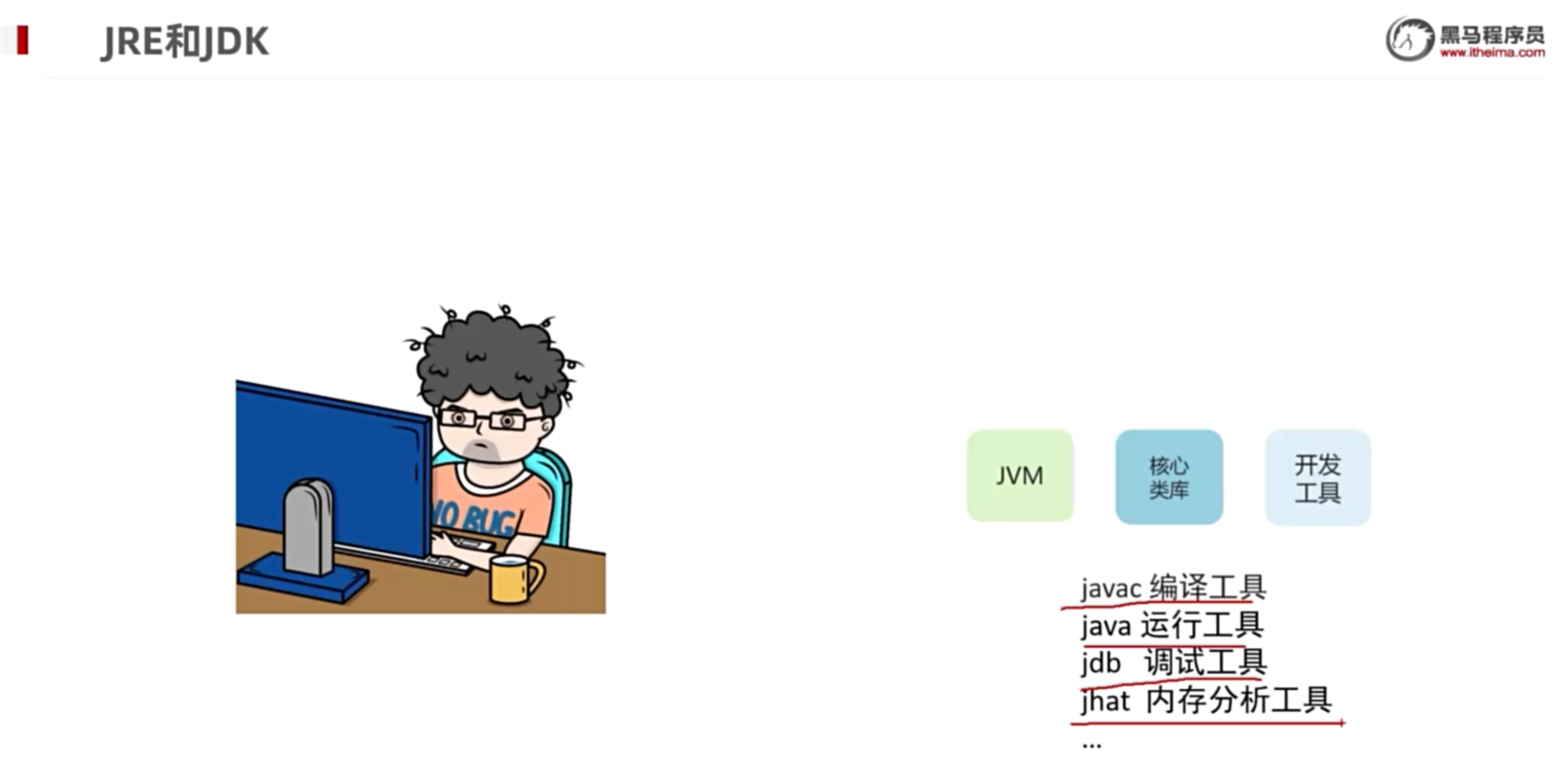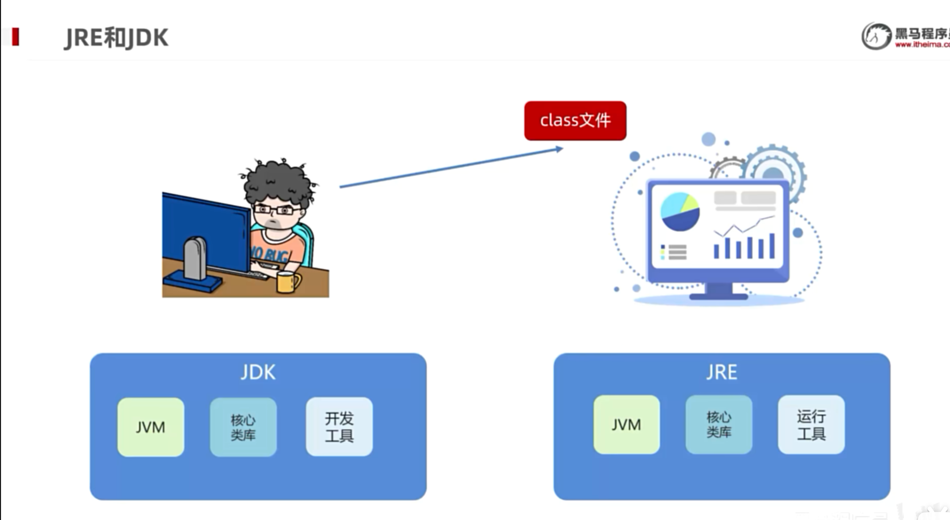 如果我们编写好的代码给到别人的电脑去运行,人家不需要修改代码的。别人的电脑就需要具备:JVM虚拟机(代码真正运行的地方)、核心类库(是Java中写好的库文件)。一部分的开发工具就不需要了如:javac编译工具、jdb调式工具。JRE就是包含以上的运行环境。