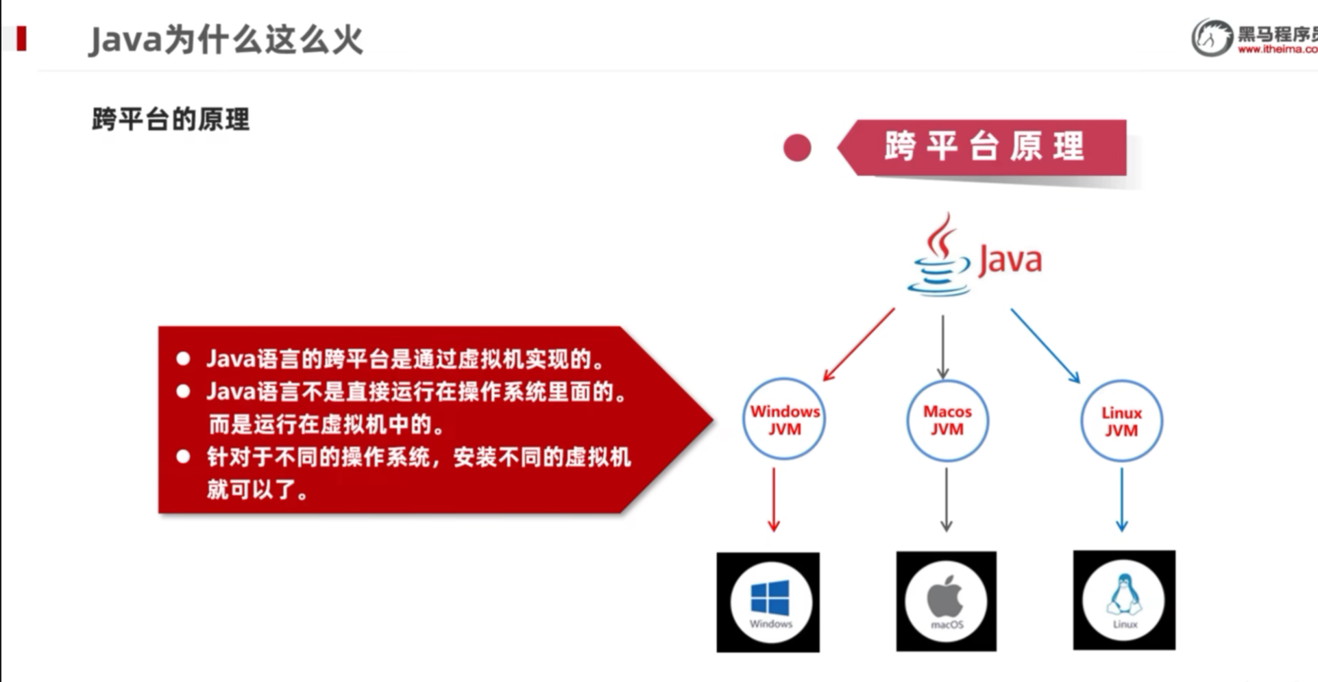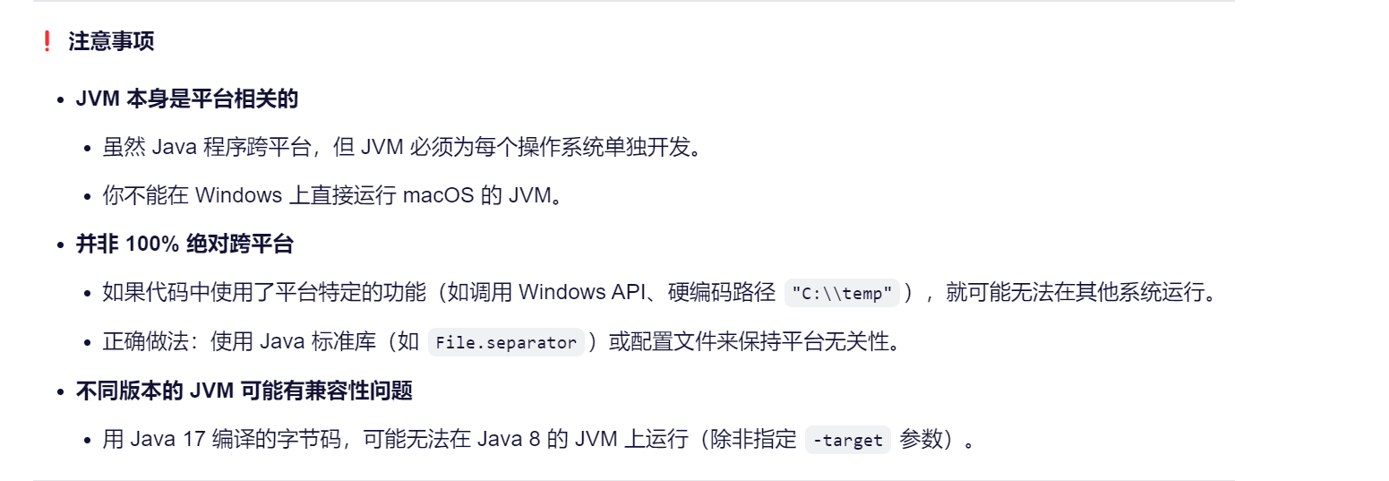 [JVM for Win] [JVM for Linux] [JVM for Mac]\ | /\ | /\ | /\ | /[相同的 .class 字节码文件]↑javac 编译生成↑Java 源代码 (.java)💡 关键点:Java 程序不直接和操作系统打交道,而是通过 JVM “中介”来运行。只要目标平台有 JVM,就能运行同一个 .class 文件。