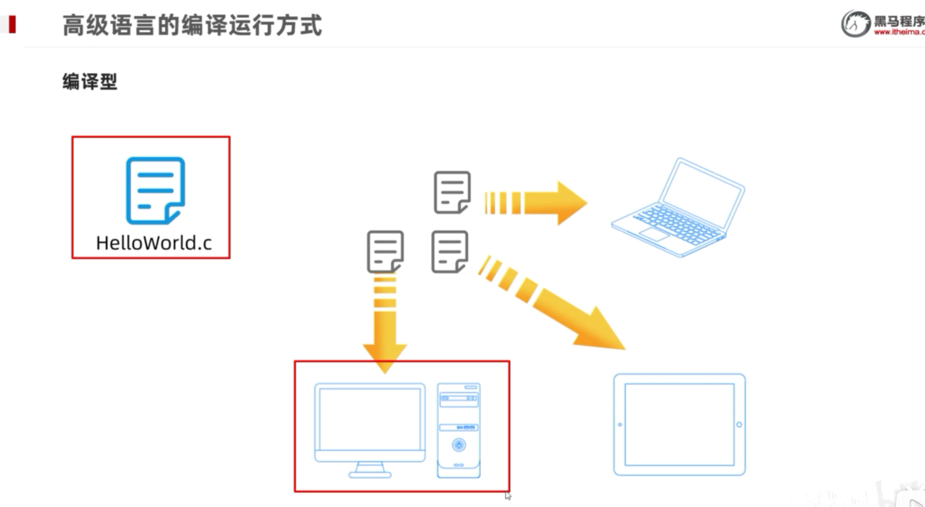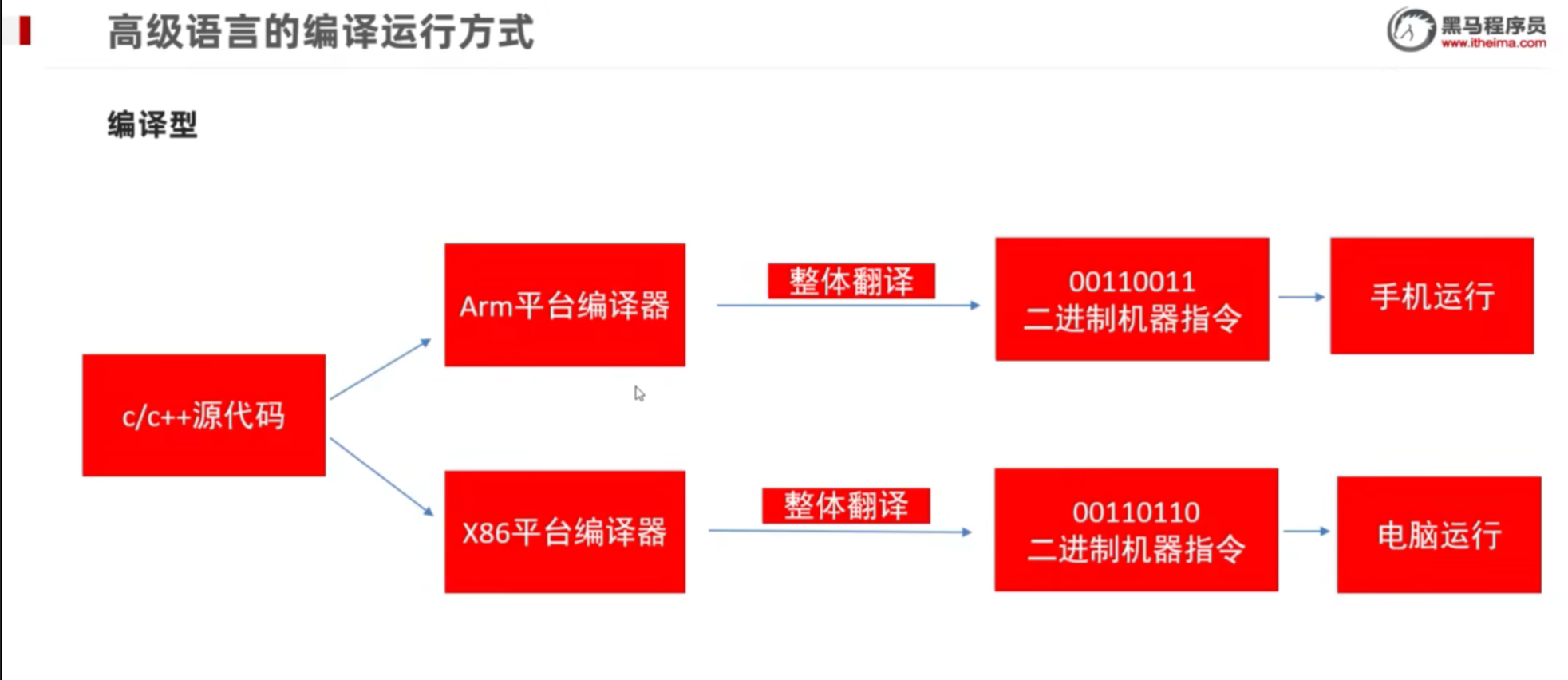 编写代码,然后整体的进行编译。多出一个后缀名为obj的文件,然后再去交给不同设备去运行。会有一个小细节:因为计算机是不一样的 ,有些硬件也可能不一样,就会存在兼容问题。那么就只能针对不同的操作系统,都要重新的进行编译,更夸张的是,我编写代码的计算机硬件跟你运行的计算机硬件差别特别大的话,就算是同一个操作系统都可能没法运行。所以就不具备跨平台性质。