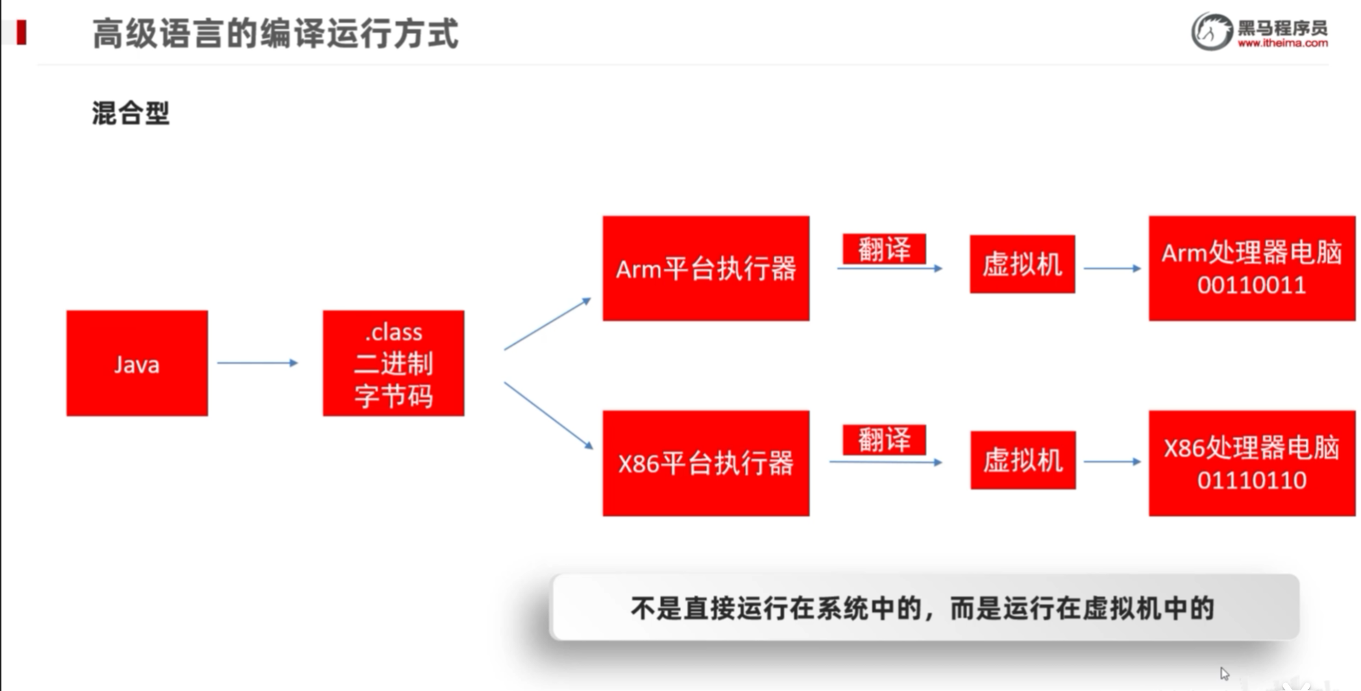 Java是混合型的,首先是把Java文件整体的编译成一个.class文件,也称之为字节码文件(与平台无关的中间代码——字节码(.class 文件))。然后再按行交给设备去运行。细节:他运行时不是直接运行在计算机中的,而是在虚拟机中。