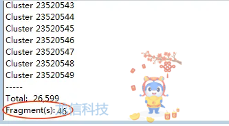 再看图上中的文件,你会发现这个文件占用了26599个簇部分,而且有46个碎片片段,说明这个文件是由46个连续的碎片组成的不连续文件。