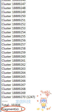 图上中我们可以看到,这个文件占用了10836个簇总数,但下面的碎片段是1,说明这个文件的所有簇在磁盘上是连续的。