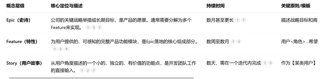 L3 Story | 用户故事 | 1 周内可开发、测试完成 | Dev/测试 | <As…I want…So that…+DOD> | 过 Sprint 计划会,估点≤8 人时 |