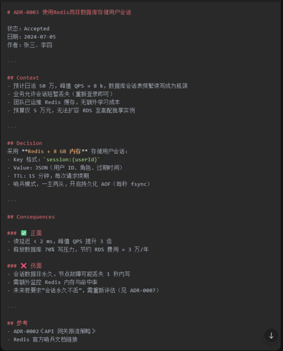 Consequences | 必填 | “好处 vs 代价” (+ 性能 3 倍,– 需运维 Redis、丢会话可接受) |